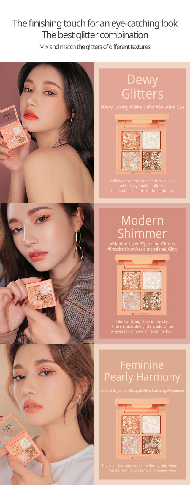 Bảng Mắt 4 ô 3CE Mini Multi Eye Color Palette #Glitter Bomb 2.8g là bảng mắt nhũ mini với 4 màu sắc hài hòa pha trộn với nhau giúp đa dạng phong cách trang điểm từ cổ điển đến sang trọng.