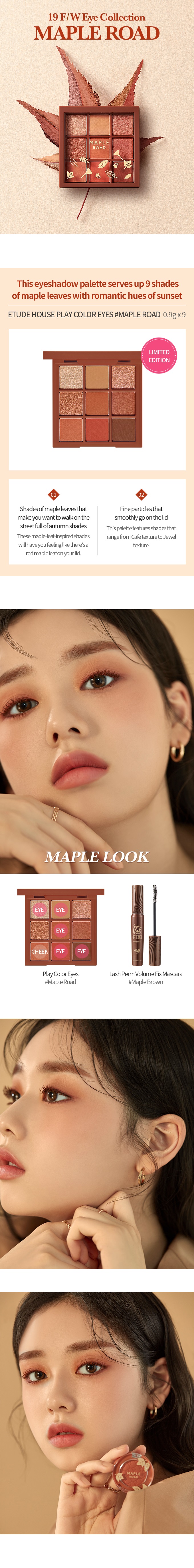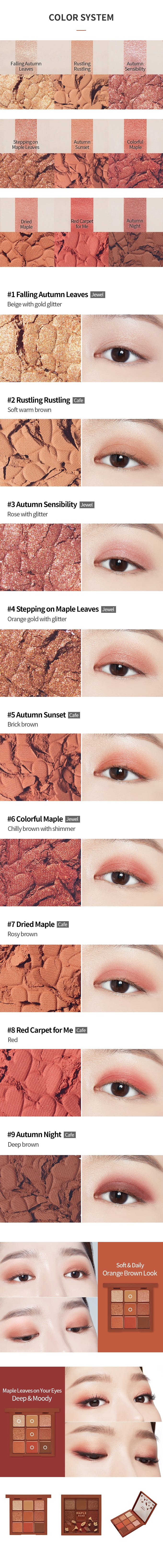 Bảng Phấn Mắt 9 Màu Etude House Play Color Eyes Maple Road 8.1g là bảng phấn mắt gồm các tone màu nâu cam, nâu đỏ, nâu hạnh nhân, nâu vàng mang đậm phong cách makeup thu đông. Chất phấn mềm mịn, không bị vón cục hay bay nhanh. Thiết kế nhỏ gọn dễ mang theo. Những tone màu từ trẻ trung, năng động đến sexy, quyến rũ. Có thể sử dụng để đánh phấn má, tạo khối, highlight.