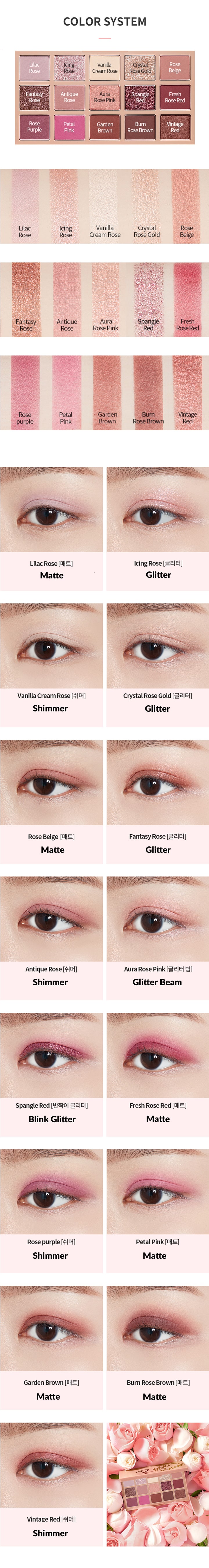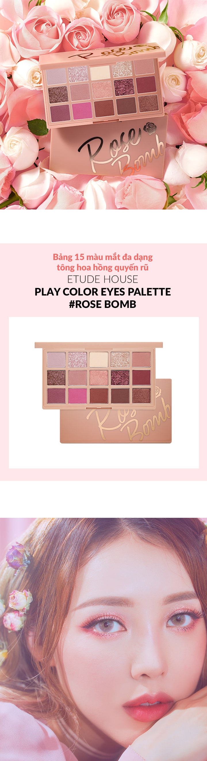 Bảng Phấn Mắt Hoa Hồng 15 Màu Etude House Play Color Eye Palette Rose Bomb 7g là bảng mắt được hãng lấy cẩm hứng từ những cánh hoa hồng ngọt ngào đang gây sốt tại Hàn Quốc. Với các tone màu đa dạng các bạn có thể phổi màu để tạo ra nhưng phong cách trang điểm khác nhau từ ngọt ngào, đến trầm ấm, sexy,…