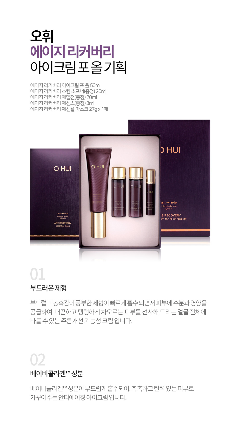 • Baby Collagen: chứa trong tất cả các sản phẩm của Age Recovery - là nghiên cứu độc quyền thuộc sở hữu của hãng mỹ phẩm OHUI.