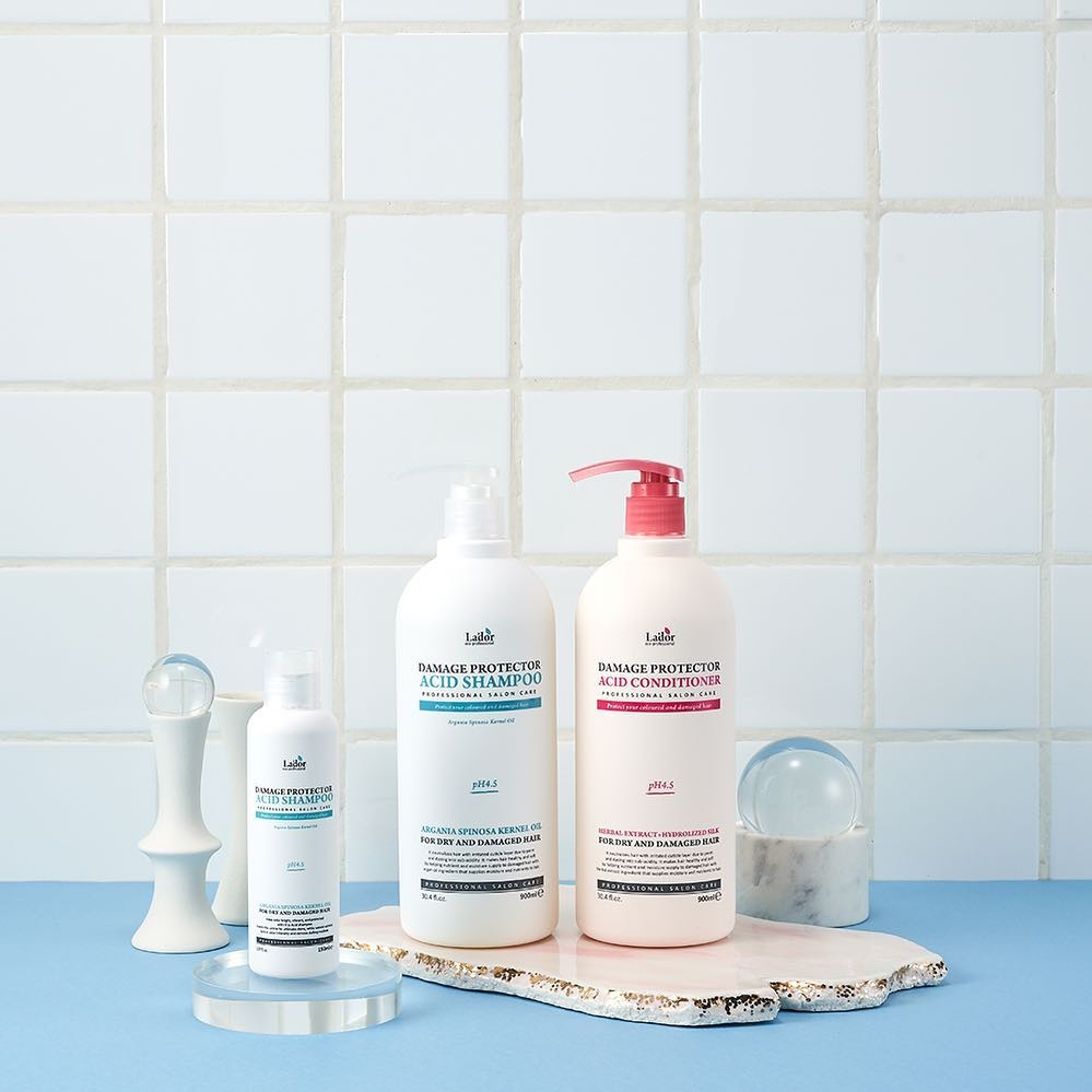 Sử dụng dầu gội và dầu xả Lador Damage Protector Acid Shampoo & Conditioner kết hợp để tăng hiệu quả bảo vệ tóc.