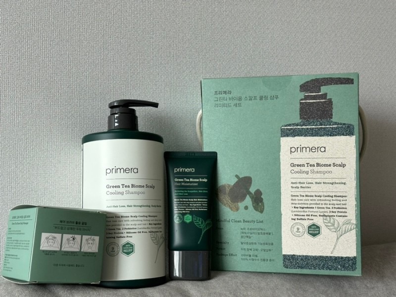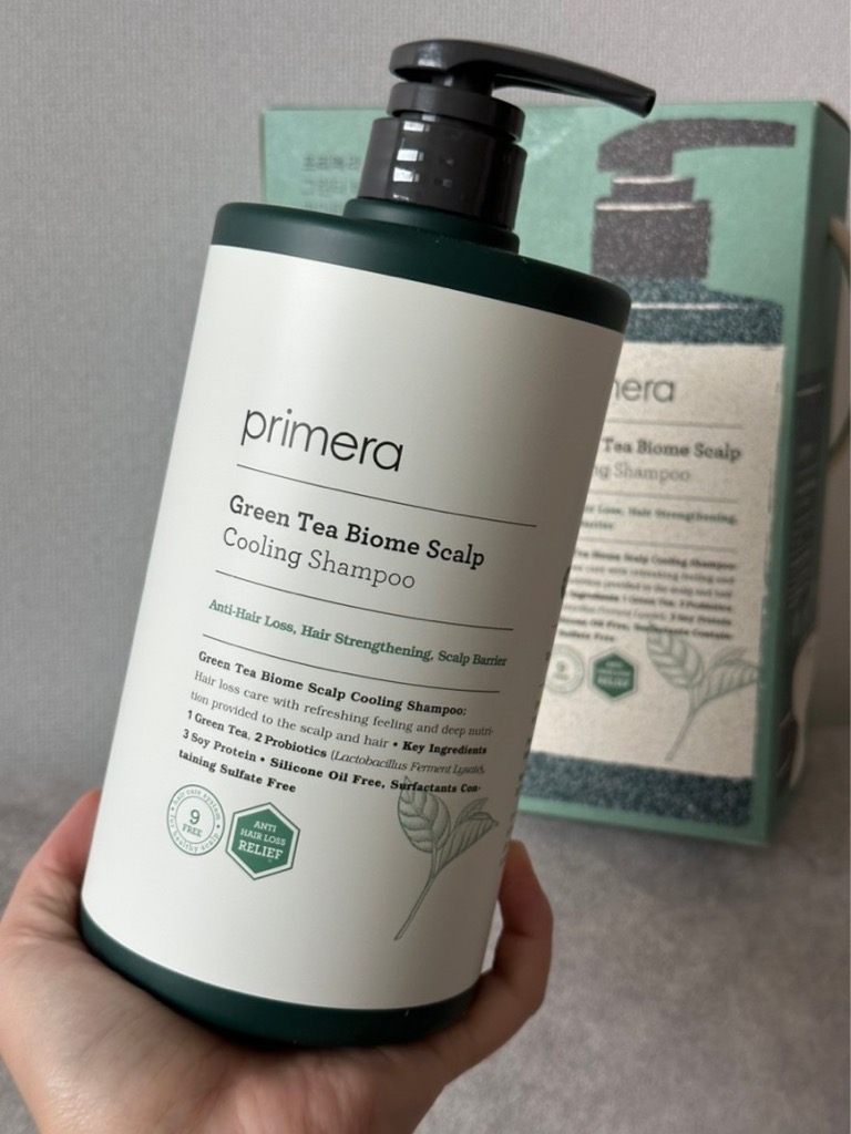 Bộ sản phẩm chăm sóc tóc rụng làm mát da đầu Primera Greentea Biome Scalp Cooling Shampoo + Kem dưỡng ẩm da đầu và tóc + lược gội đầu massage da đầu
