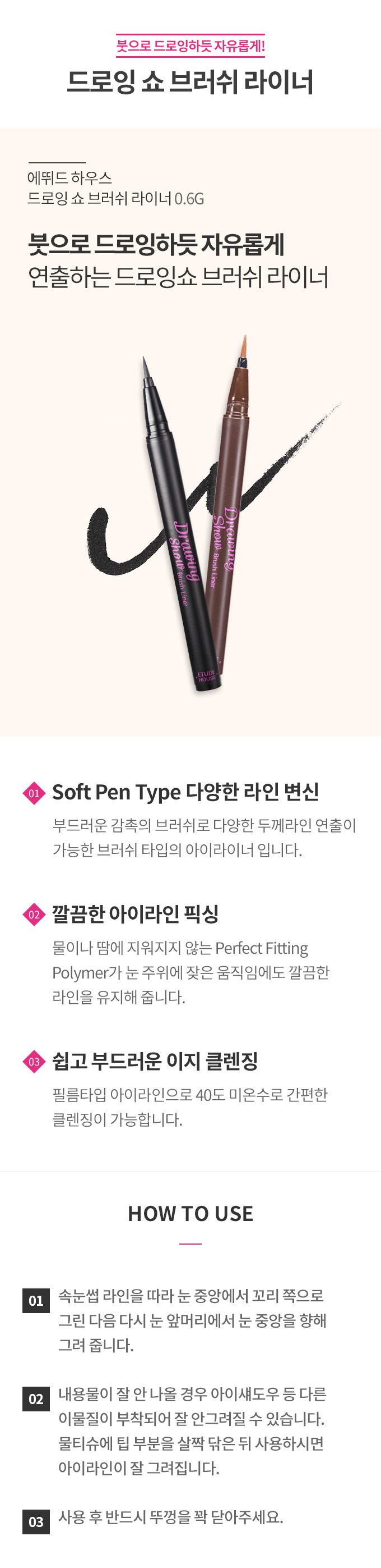 Bút Kẻ Mắt Etude House Drawing Show Brush Liner 0.6g là bít kẻ mắt với đầu bút mềm bạn có thể vẽ các đường với dọ dày khác nhau một cách dễ dàng với đầu bút mềm và đàn hồi tốt, tạo đường kẻ mắt liền mạch, sắc nét. Đầu bút giữ màu tốt nên bạn có thể kẻ nhanh chóng, chuẩn xác, tránh việc kẻ đi kẻ lại dễ bị lem. Dễ dàng và nhẹ nhàng tẩy trang