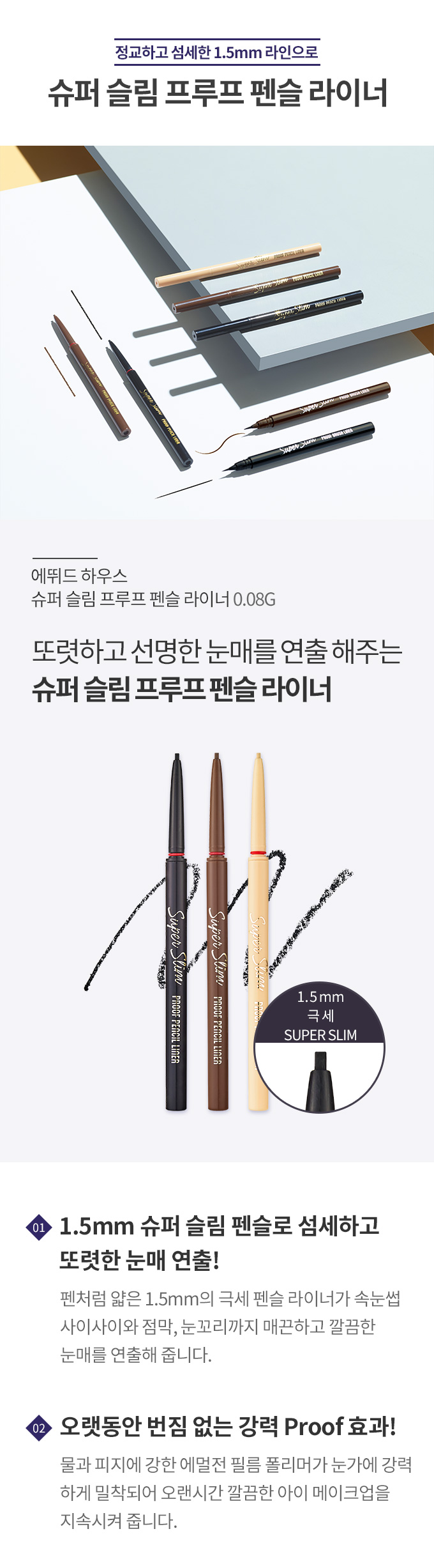Chì kẻ mắt Etude House Super Slim Proof Pencil Liner là sản phẩm chì kẻ viền mắt với đàu chì siêu mảnh, chì nhỏ 1.5mm giúp tạo đường viền rõ nét và tự nhiên. Có khả năng chống nước cao giúp đường kẻ không bị trôi lem bởi nước, mồ hôi, …