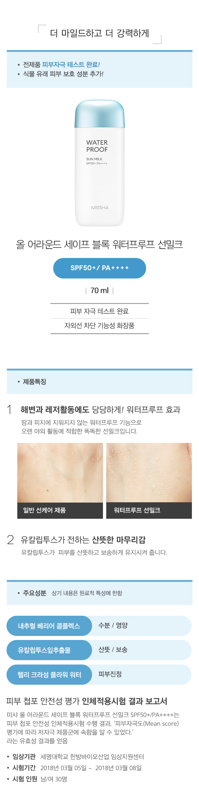 Missha All Around Safe Block Waterproof Sun Milk là kem chống nắng vật lý dạng sữa, có chất chống nắng vô cơ dành cho những hoạt động ngoài trời, với kết cấu lỏng dễ dàng thẩm thấu vào da. Missha All around safe block waterproof sun milk bảo vệ da tuyệt đối khỏi ánh nắng mặt trời và các tia cực tím lên đến 8 giờ đồng hồ. Missha cam kết người sử dụng sẽ có bề mặt da khô thoáng, không nhờn dính, bí bách, da lên tông tự nhiên sau khi sử dụng sản phẩm kem chống nắng này.