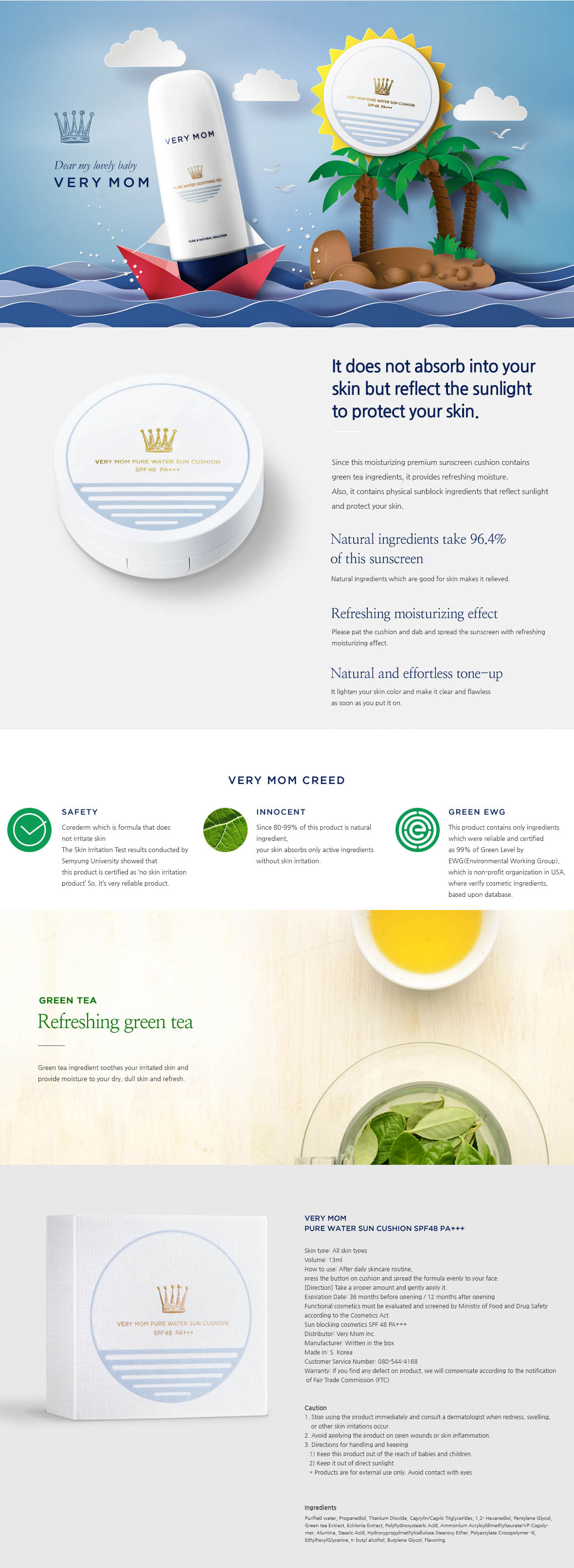 Chống Nắng Phấn Nước Dành Cho Bà Bầu Very Mom Pure Water Sun Cushion SPF 48 PA+++ 13ml là chống nắng vật lí dạng phấn nước với thành phần trà xanh, cung cấp độ ẩm cho da, chống tia UV bảo vệ da và nâng tông da sáng lên ngay sau khi bôi.