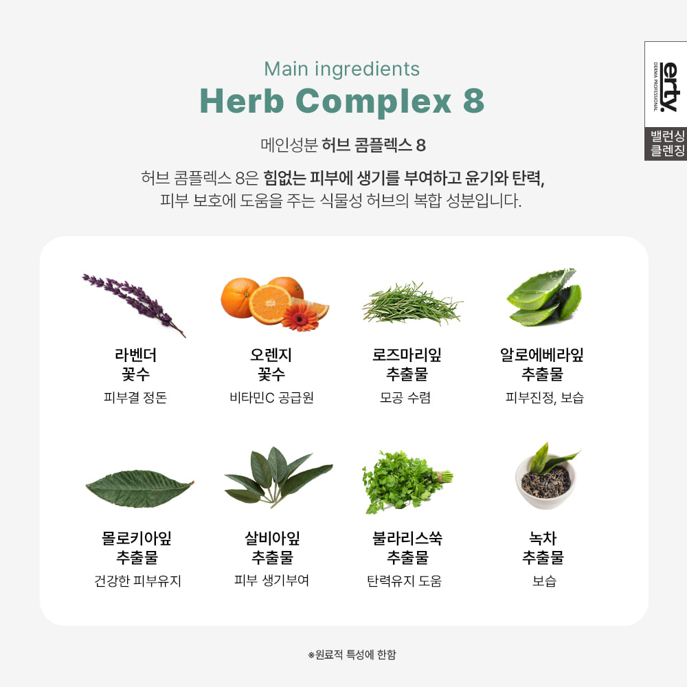 Làm dịu & Cân bằng: Phức hợp Thảo mộc 8 giúp cân bằng lượng dầu và độ ẩm của da, đồng thời làm dịu kích ứng, phù hợp với làn da nhạy cảm.