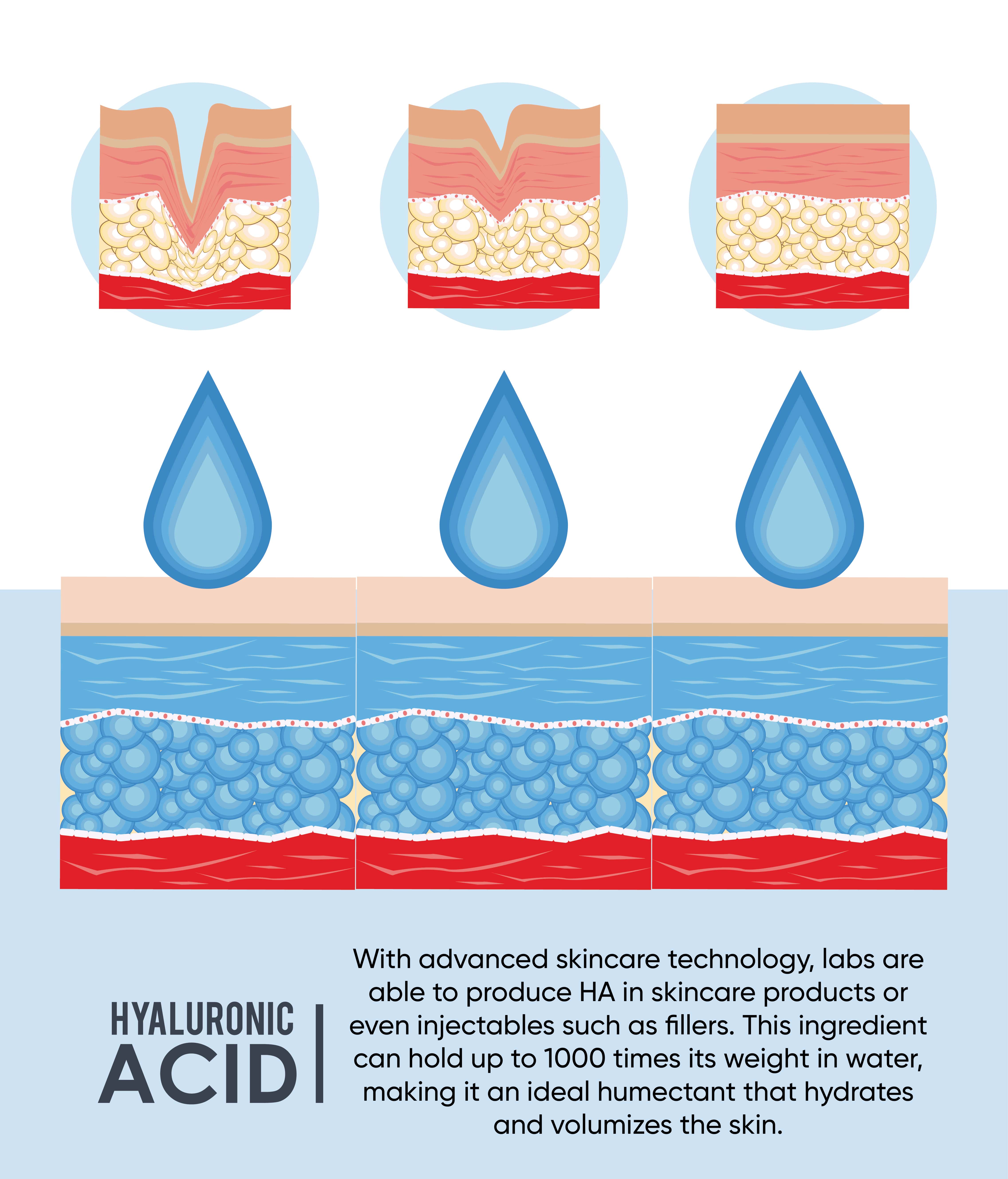 Như đã đề cập trong sơ đồ trên, chức năng chính của axit hyaluronic là giữ lại độ ẩm cho da để có một làn da ngậm nước. Mặc dù nó là một chất tự nhiên xuất hiện trong cơ thể chúng ta, chúng ta có xu hướng sản xuất ít hơn khi cơ thể già đi. Da của chúng ta trở nên khô hơn, mất độ ẩm và không bị co giãn hay cứng. Điều cuối cùng chúng ta muốn là làn da của chúng ta trông mất nước và lão hóa.