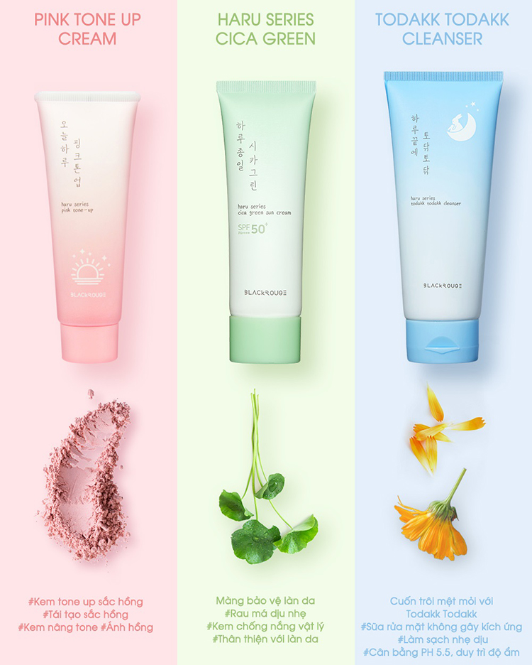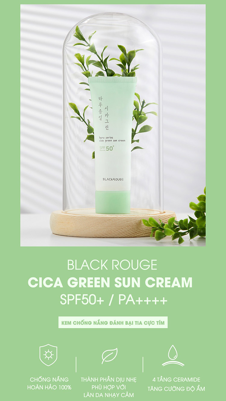 Kem Chống Nắng Chiết Xuất Rau Má Black Rouge Haru Series Cica Green Sun Cream 50ml SPF50+ PA++++ là kem chống nắng với thành phần chính: Rau má, mùi tây, diếp cá. Duy trì sự đàn hồi và mềm mại cho làn da, cấp ẩm tức thì ngay khi sử dụng.