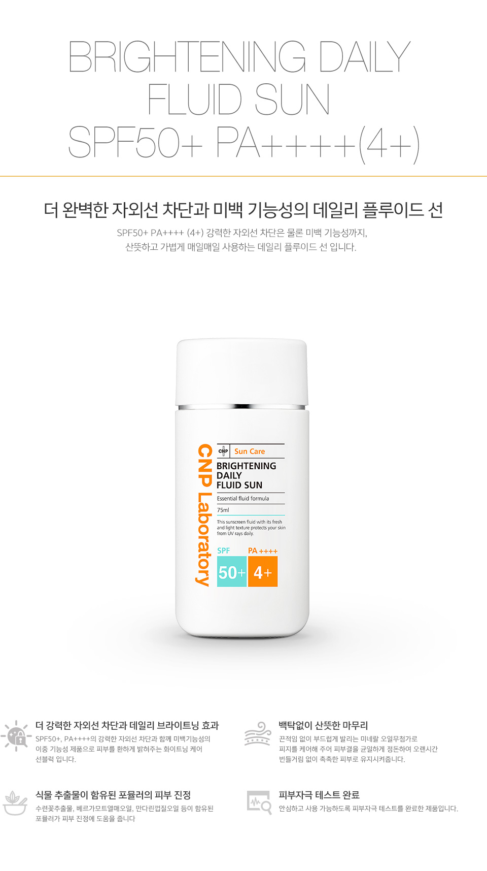Kem Chống Nắng Dạng Sữa CNP Laboratory Brightening Daily Fluid Sun 75ml SPF50+PA++++ là kem chống nắng dạng sữa bảo vệ làn da của bạn khỏi tia UV hàng ngày. Kem chống nắng mạnh mẽ SPF50 + PA ++++ và làm da sáng khi sử dụng.