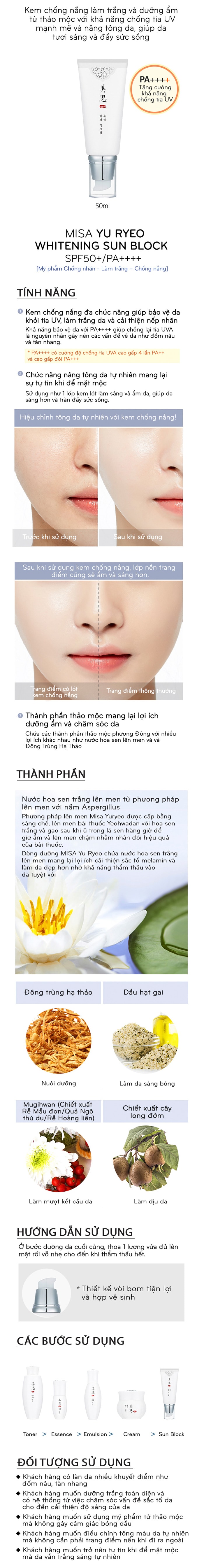 Missha Misa Yu Ryeo Whitening Sun Block là sản phẩm kem chống nắng với chỉ số SPF50+/PA++++ có khả năng bảo vệ da, chống tác hại của tia UV. Với các thành phần chính từ thảo mộc như nước hoa sen trắng lên men từ phương pháp đông y lên men với nấm Aspergillus, Đông trùng hạ thảo, Mugihwan (chiết xuất rễ mẫu đơn, quả ngô thù du, rễ hoàng liên), chiết xuất quả Tiếu hồi, quả Dương đào mang lại tác dụng hỗ trợ dưỡng ẩm, chăm sóc, dưỡng trắng, làm dịu da.