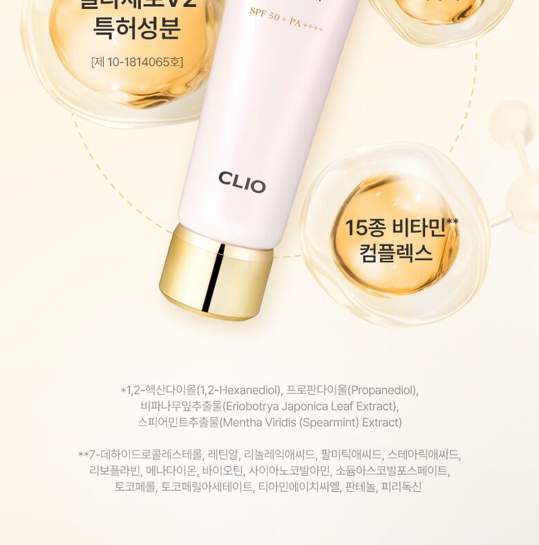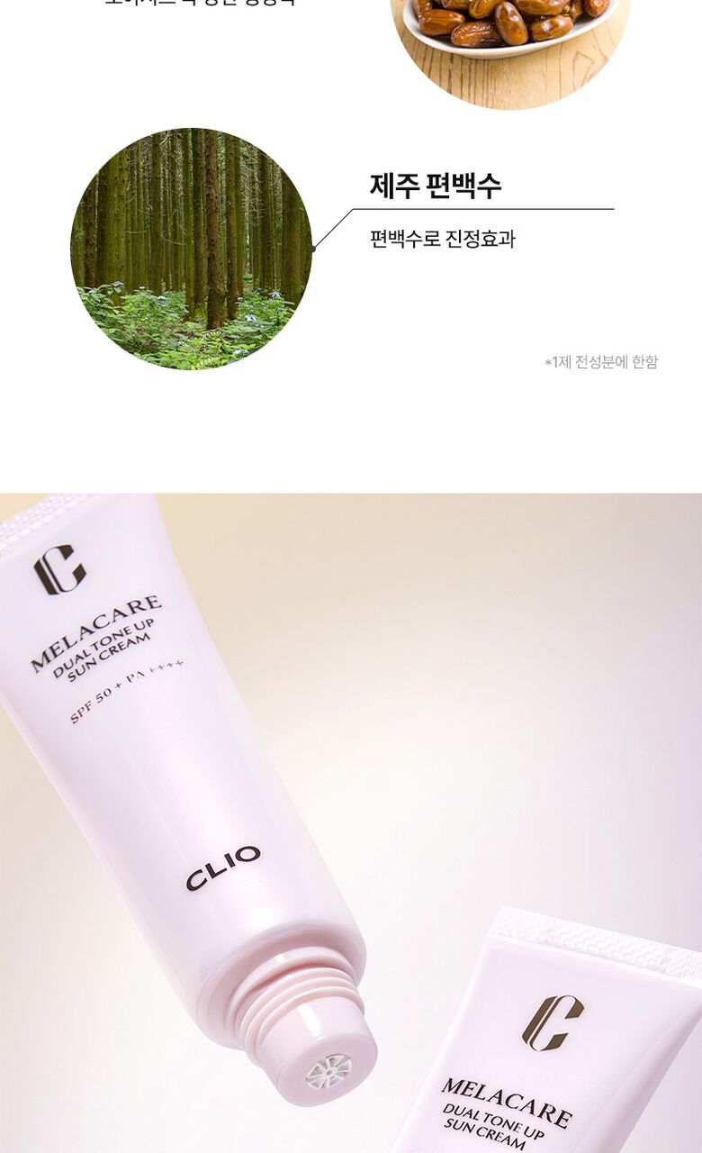 Kem chống nắng nâng tông da Clio Melacare Dual Tone Up Sun Cream chứa các dẫn xuất vitamin C (axit ascorbic, natri ascorbyl phosphate, tetrahexyldecyl ascorbate) và niacinamide để cải thiện tàn nhang và làm trắng da.