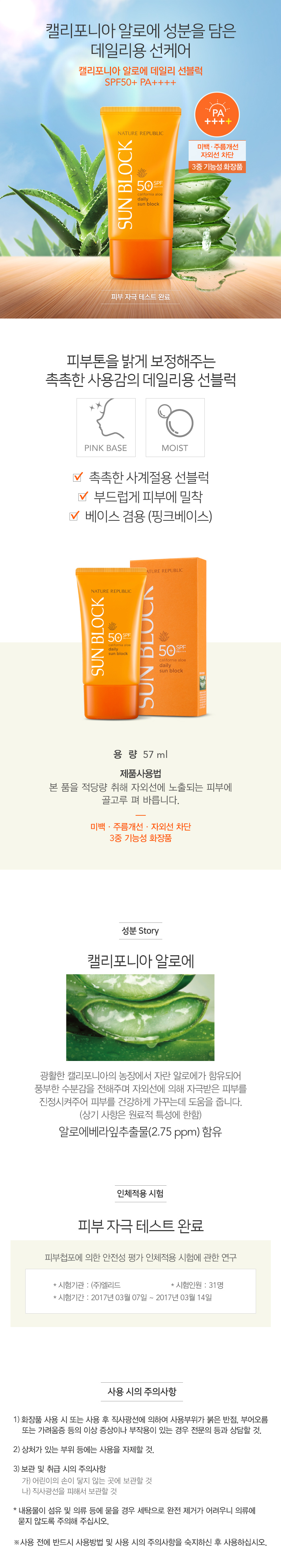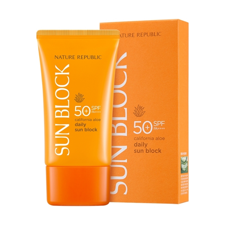 Kem Chống Nắng Nature Republic California Aloe Daily Sun Block SPF50+PA++++ 57ml là kem chống nắng có bổ sung chức năng dưỡng ẩm và cân bằng tông màu da. Chiết xuất lô hội, cung cấp độ ẩm và dưỡng chất, duy trì bề mặt da mềm mại, mịn màng. Chất kem mịn mướt màu hồng nhạt có chứa Niacinamide và Adenosine sẽ cải thiện tông màu da, giúp làn da sáng hồng, rạng rỡ hơn. Sản phẩm tiệp nhanh vào da, không để lại cảm giác nhờn dính, khó chịu.