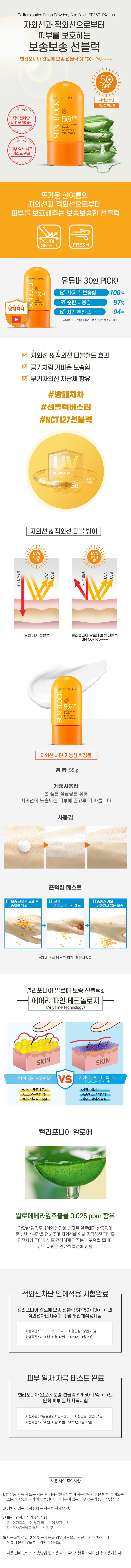 Kem Chống Nắng Nature Republic California Aloe Fresh Powdery Sun Block SPF50+ PA++++ 55g là kem chống nắng vật lý với màng kép giúp da chống lại tác động của tia UV và tia IR hồng ngoại. Chứa chiết xuất từ lô hội giúp dưỡng ẩm và làm dịu làn da kích ứng. Chất kem mịn và không bị bết rít sau khi bôi.