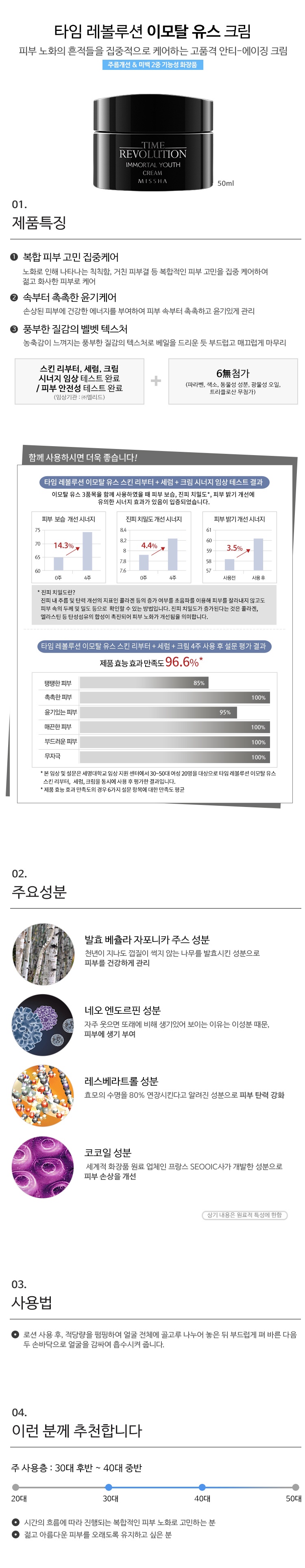 Kem Dưỡng Chống Lão Hóa Trẻ Hóa Da Missha Time Revolution Immortal Youth Cream 50ml là kem dưỡng da chống lão hoá, đặc biệt trẻ hoá làn da bằng cách xoá mờ nếp nhăn do tuổi tác gây ra. Tăng cường độ ẩm, nuôi dưỡng làn da trắng sáng và mịn màng. Cung cấp dưỡng chất và Vitamin giúp làn da khoẻ mạnh, căng tràn sức sống.