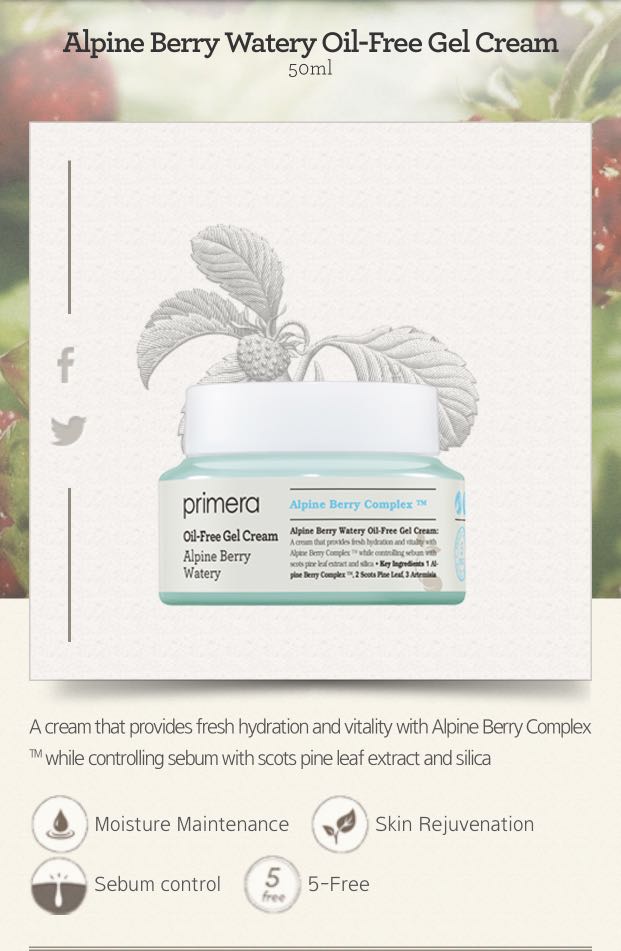Kem Dưỡng Dạng Gel Cấp Nước Cho Da Primera Alpine Berry Watery Oil-Free Gel Cream 50ml là kem gel dưỡng ẩm không dầu, bổ sung độ ẩm lý tưởng cho da mất nước, da dầu thiéu nước . Với độ ẩm mà không làm cho da quá bóng hoặc nhờn do dầu thừa. Mang lại sức sống cho làn da.
