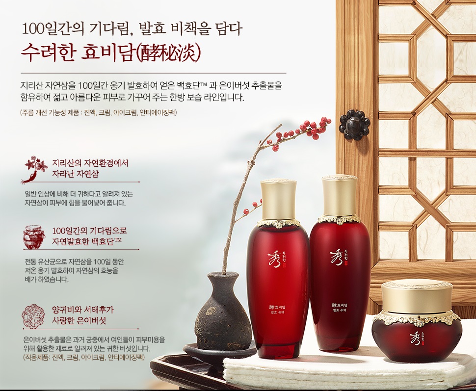 Baekhyodan™ - Nó là thành phần thu được bằng cách diễn giải lại phương pháp lên men tự nhiên theo cách hiện đại, sử dụng vi khuẩn axit lactic phân lập từ trái tim lên men và lên men nhân sâm tự nhiên quý giá được trồng ở độ cao 700 mét so với mực nước biển trên núi Jiri trong đồ gốm ở nhiệt độ thấp trong 100 ngày. Khi nhân sâm tự nhiên trải qua quá trình lên men 100 ngày, các thành phần hoạt tính của nó sẽ bị giảm xuống thành các phân tử thấp.