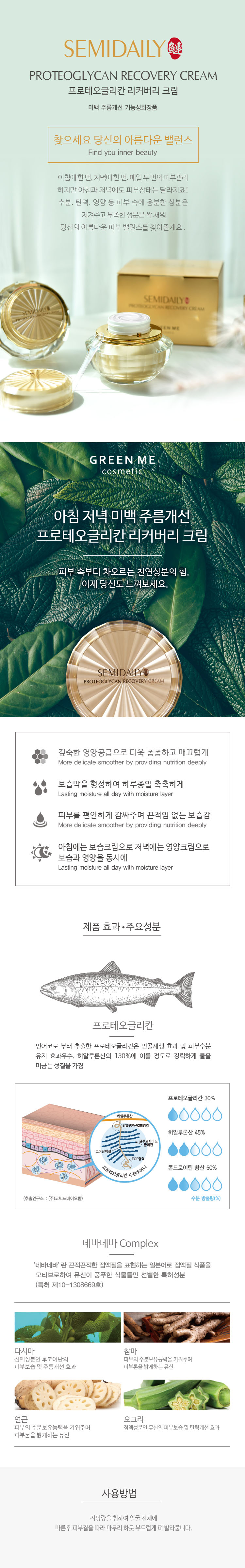 Thành phần chính bao gồm hợp chất Proteoglycan được chiết xuất từ sụn mũi cá hồi , duy trì độ ẩm cho da trong thời gian dài. Thêm vào đó là các thành phần từ thực vât như tảo bẹ, gừng, ngó sen, đậu bắp