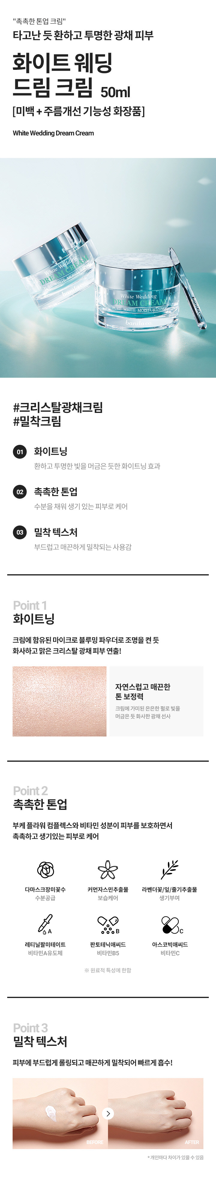Kem dưỡng trắng nâng tông da trắng sáng tự nhiên BANILA CO White Wedding Dream Cream 50ml là loại kem đặc biết chứa bột siêu nhỏ có trong kem tạo nên làn da tươi sáng, trong trẻo như pha lê như thể được bật đèn lên! Chỉnh sửa tông màu tự nhiên và mượt mà. Những viên ngọc trai tinh tế được thêm vào kem mang lại ánh sáng rực rỡ như thể được ngâm trong ánh sáng.