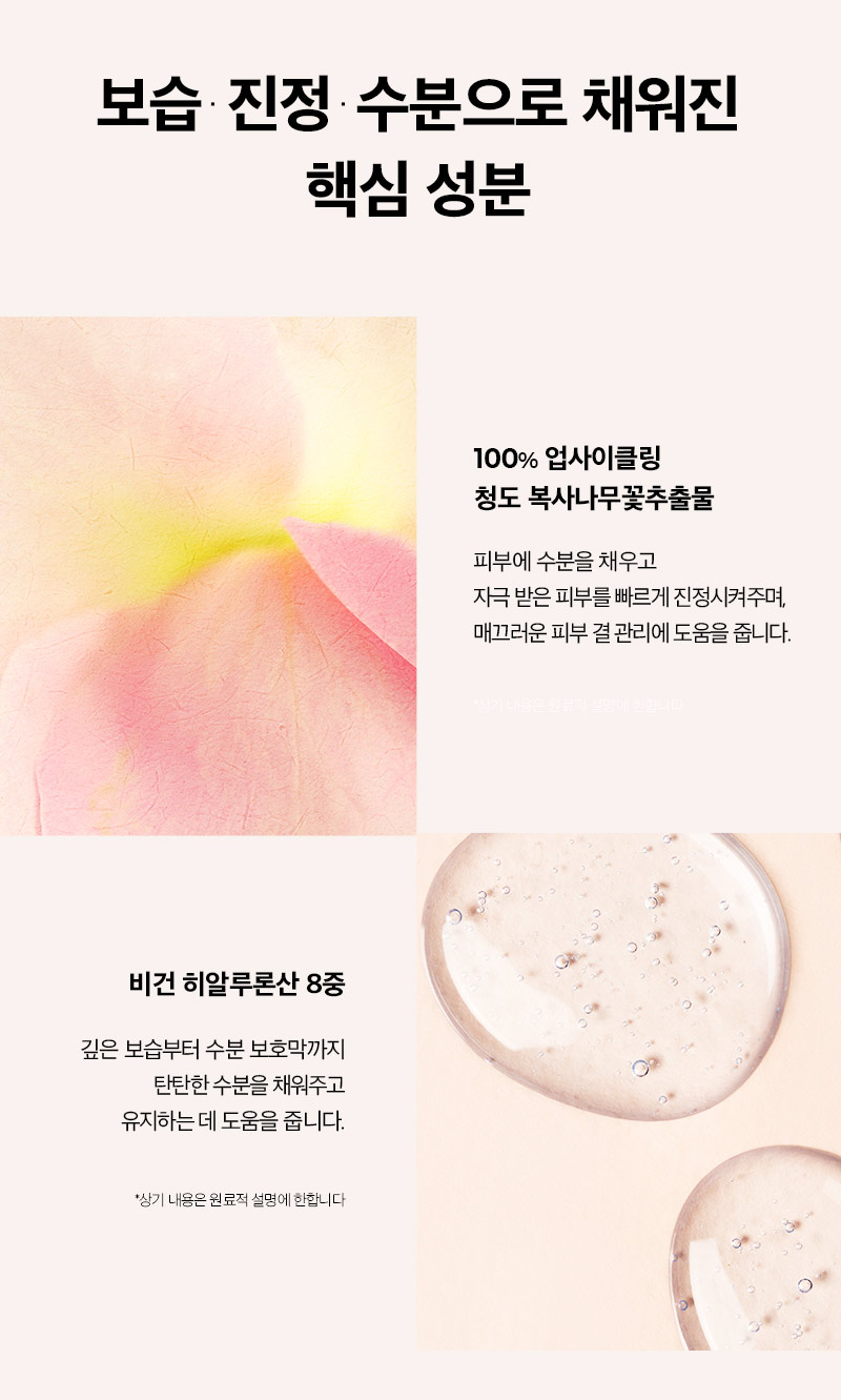 - Chứa 100% chiết xuất hoa đào tái chế giúp dưỡng ẩm cho da và nhanh chóng làm dịu làn da bị kích ứng đồng thời giúp kết cấu da mịn màng.