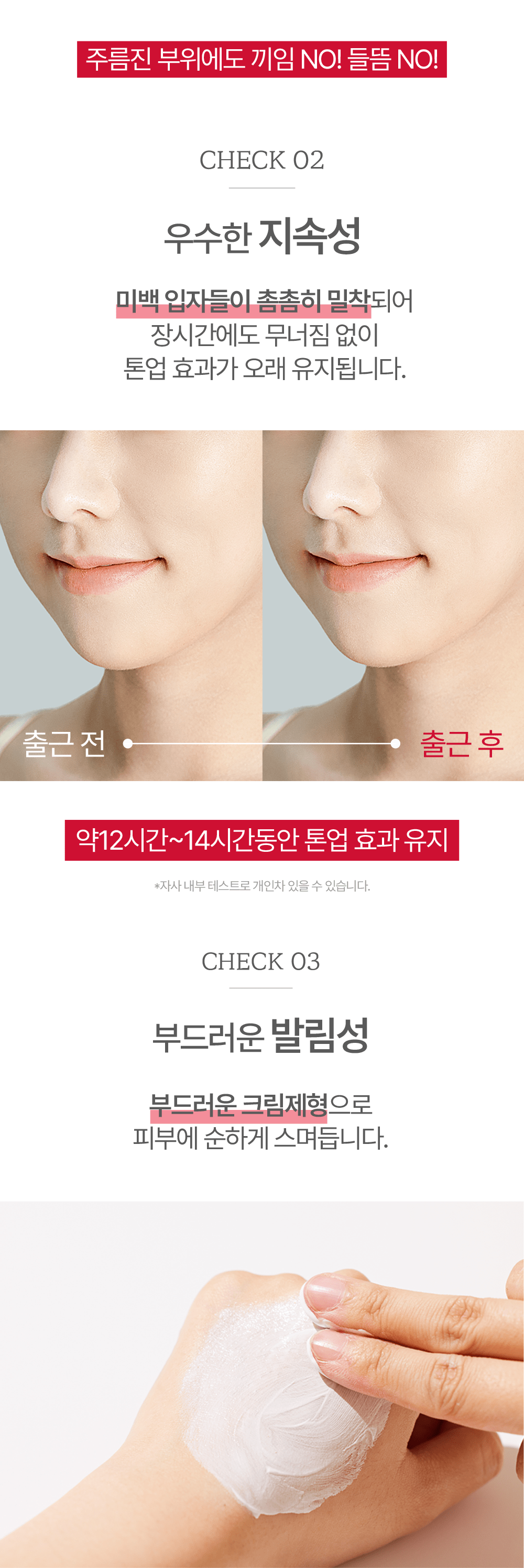 - Kem nâng tông da bám chặt ngay khi thoa mà không bị trôi hay lem ngay cả khi đổ mồ hôi và bền màu