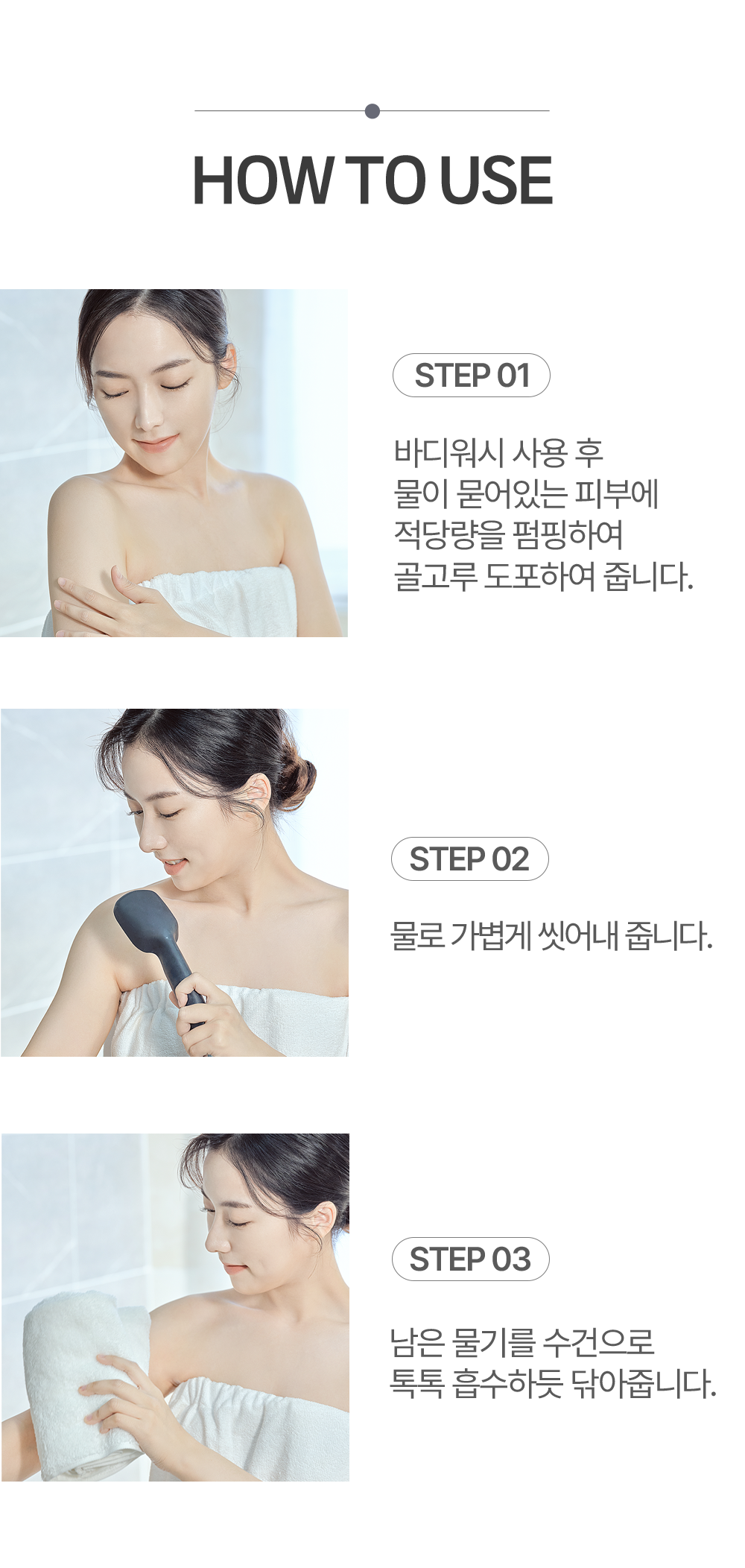 1. Sau khi sử dụng sữa tắm, bơm một lượng thích hợp lên da ướt và thoa đều.
