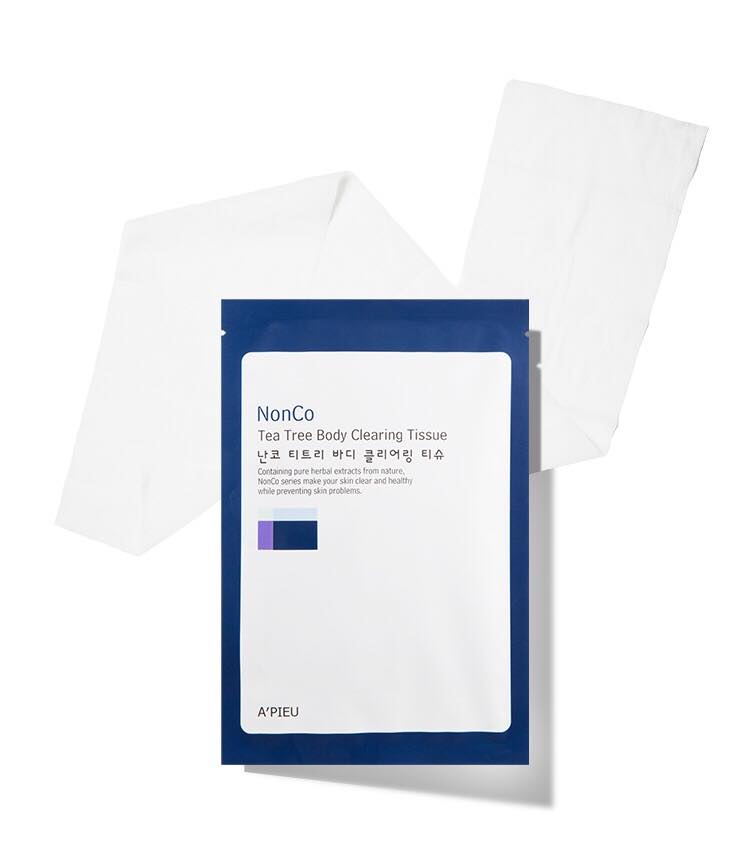 Khăn Giấy Cho Body A'pieu Nonco Tea Tree Body Clearing Tissue 23g là khăn giấy dành cho body có làn da nhạy cảm. Với kích cỡ siêu bự: 100cm chiều dài x 15cm chiều rộng, sản phẩm chứa tinh dầu từ lá cây tràm trà và thảo mộc tinh khiết từ thiên nhiên giúp làm sạch và dịu làn da nhạy cảm, cung cấp thêm độ ẩm đồng thời ngăn ngừa các vấn đề về da.