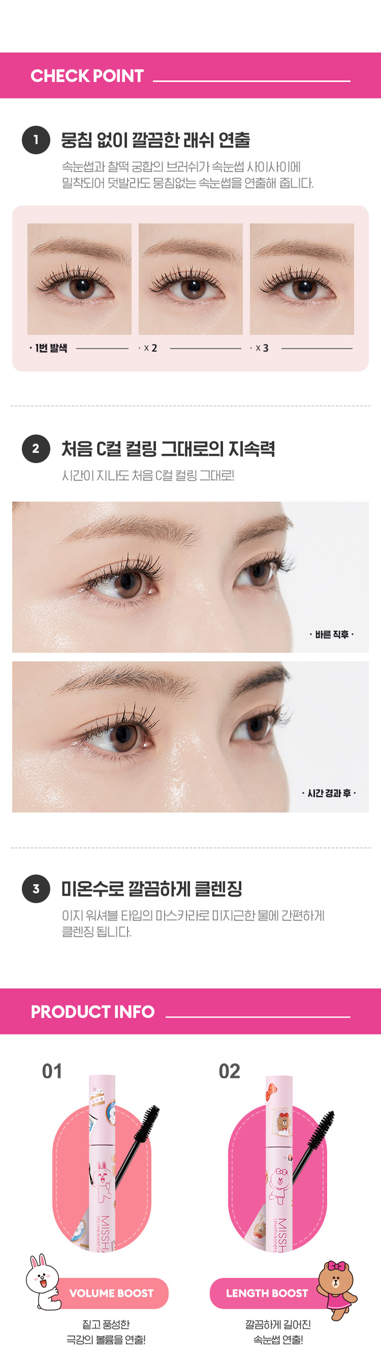 Mascara Missha Làm Dày Mi Volume Boost Cara Line Friends Edition 8.5g là mascara không lem và chống thấm nước. Giúp mi cong và sắc sảo suốt nhiều giờ liền mà không tạo hiệu ứng khô cứng hoặc vón cục thiếu tự nhiên.