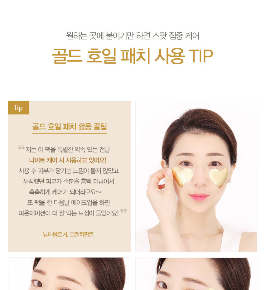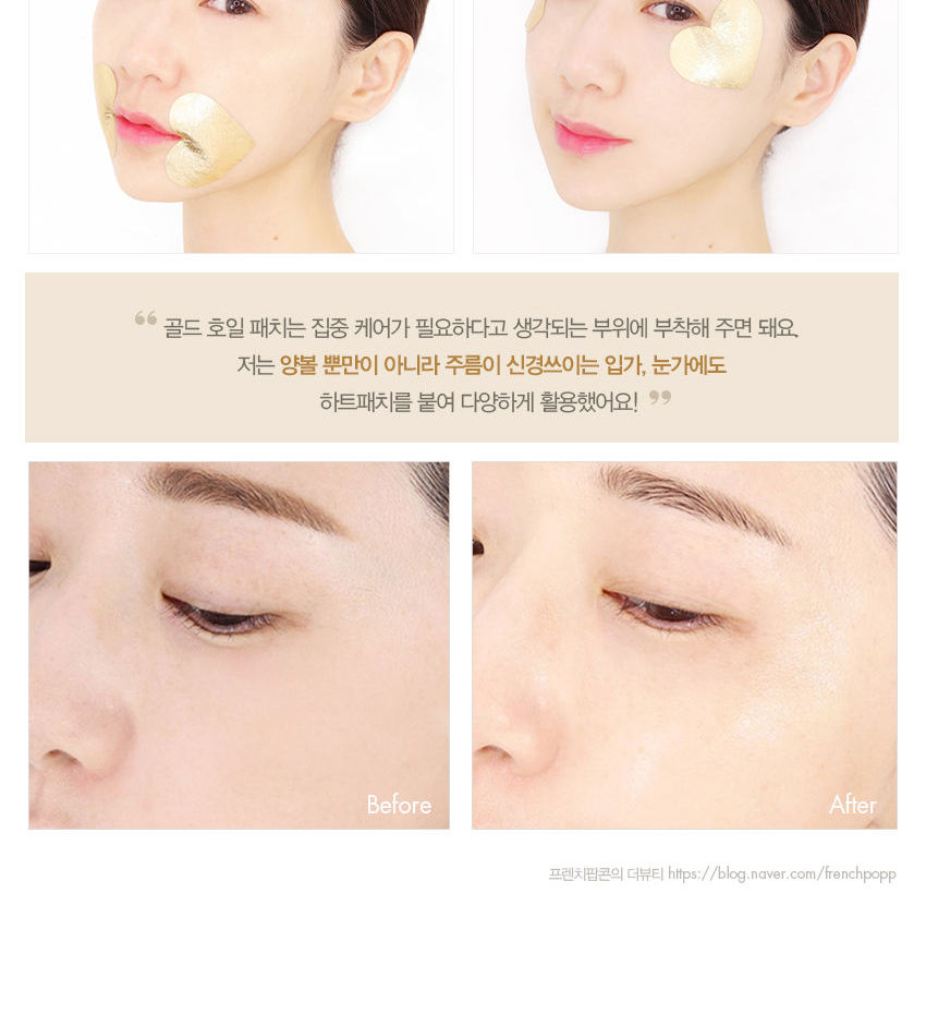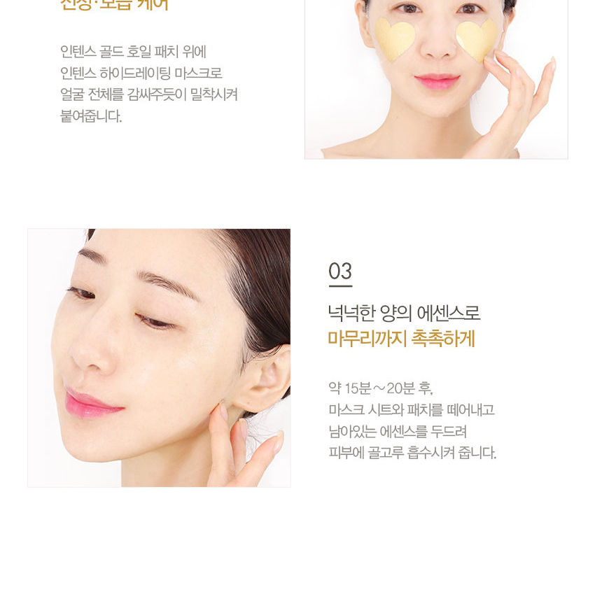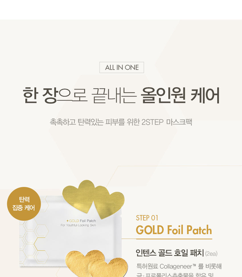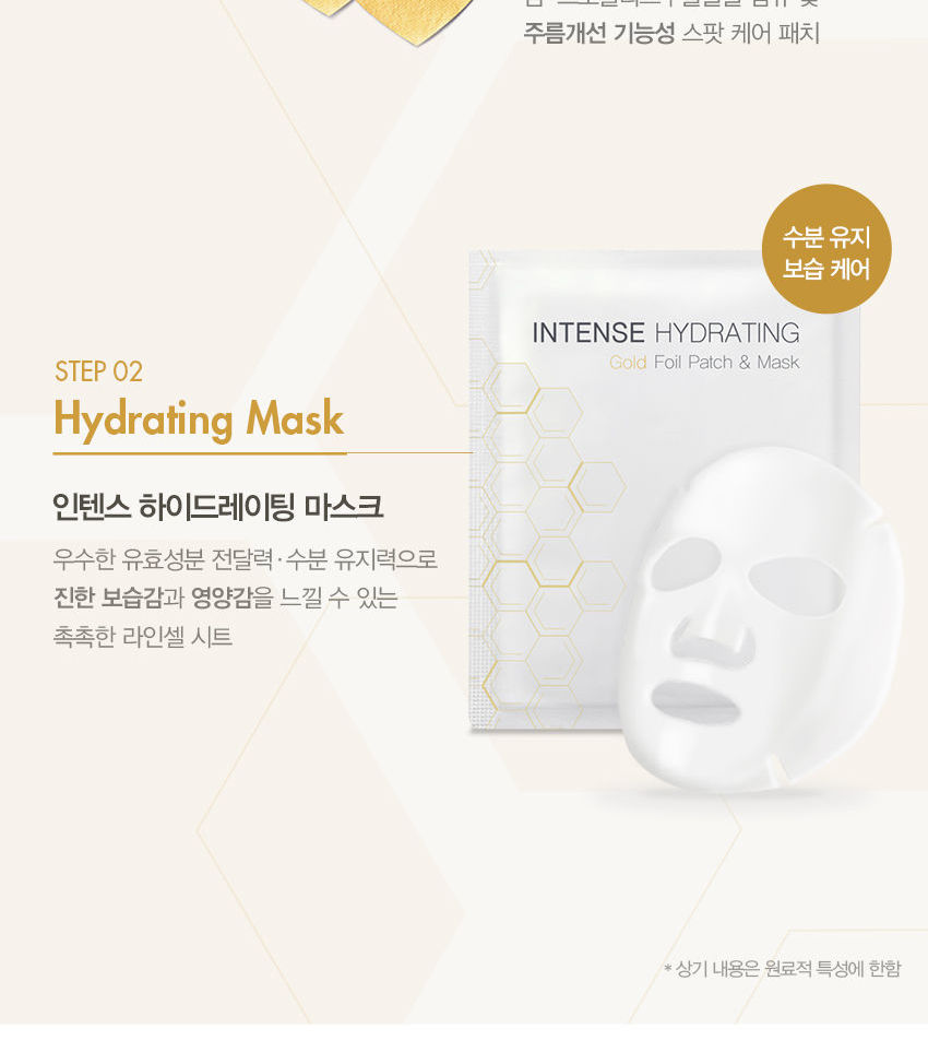 Là mặt nạ với 2 bước chăm sóc da. Miếng dán màu vàng để chăm sóc trên khu vực mong muốn. Thành phần chứa vàng 24k và keo ong được cấp bằng sáng chế Collageneer ™ để cải thiện nếp nhăn. Mặt nạ dưỡng ẩm chuyên sâu cung cấp dưỡng chất và giữ độ ẩm hiệu quả. Chứa chiết xuất cam thảo để bảo vệ da khỏi các tác nhân bên ngoài và giữ ẩm cho da.