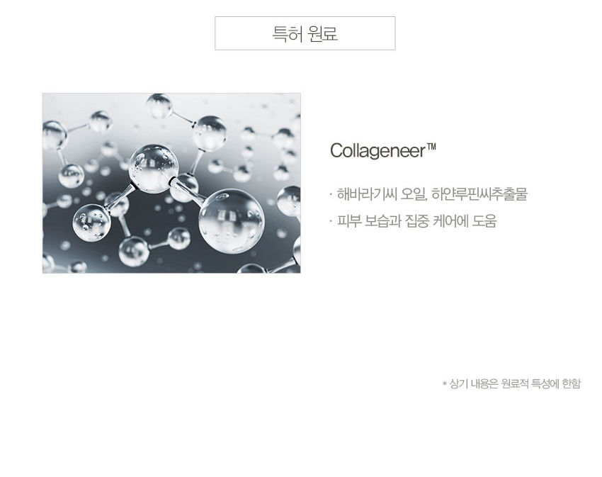 Thành phần chính Collageneer : Dầu hạt hướng dương, chiết xuất hạt Lupin trắng : Giúp giữ ẩm và chăm sóc da chuyên sâu Chiết xuất keo ong : Thành phần dinh dưỡng phong phú bảo vệ da / Hiệu quả giữ ẩm tuyệt vời Vàng : Làn da khỏe mạnh rạng rỡ / Nuôi dưỡng làn da Chiết xuất từ rễ Glycyrrhiza Uralensis (Cam thảo) : Bảo vệ giúp da được giữ ẩm và mịn màng với fructos