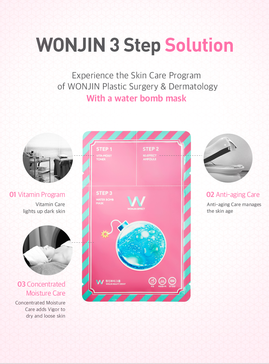 Mặt Nạ Cấp Nước Da Căng Bóng Mịn 3 Bước Wonjin Effect Water Bomb Mask là mặt ba cấp ẩm chuyên sâu. Với hàm lượng độ ẩm cao cùng 3 bước chăm sóc da Water bomb mask mang đến làn da căng mọng, ngậm nước, mịn màng.
