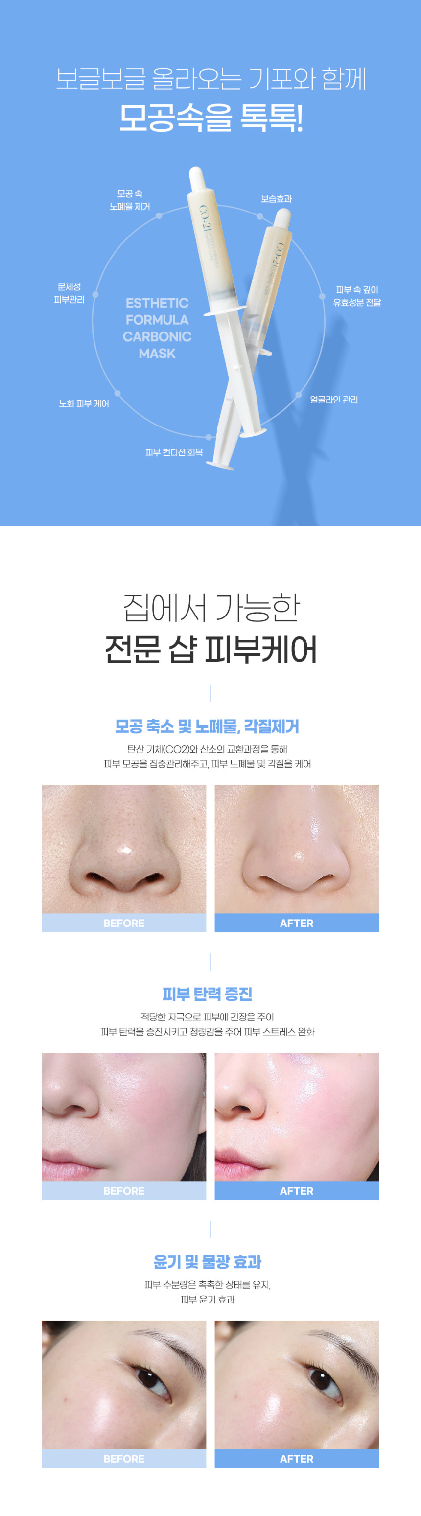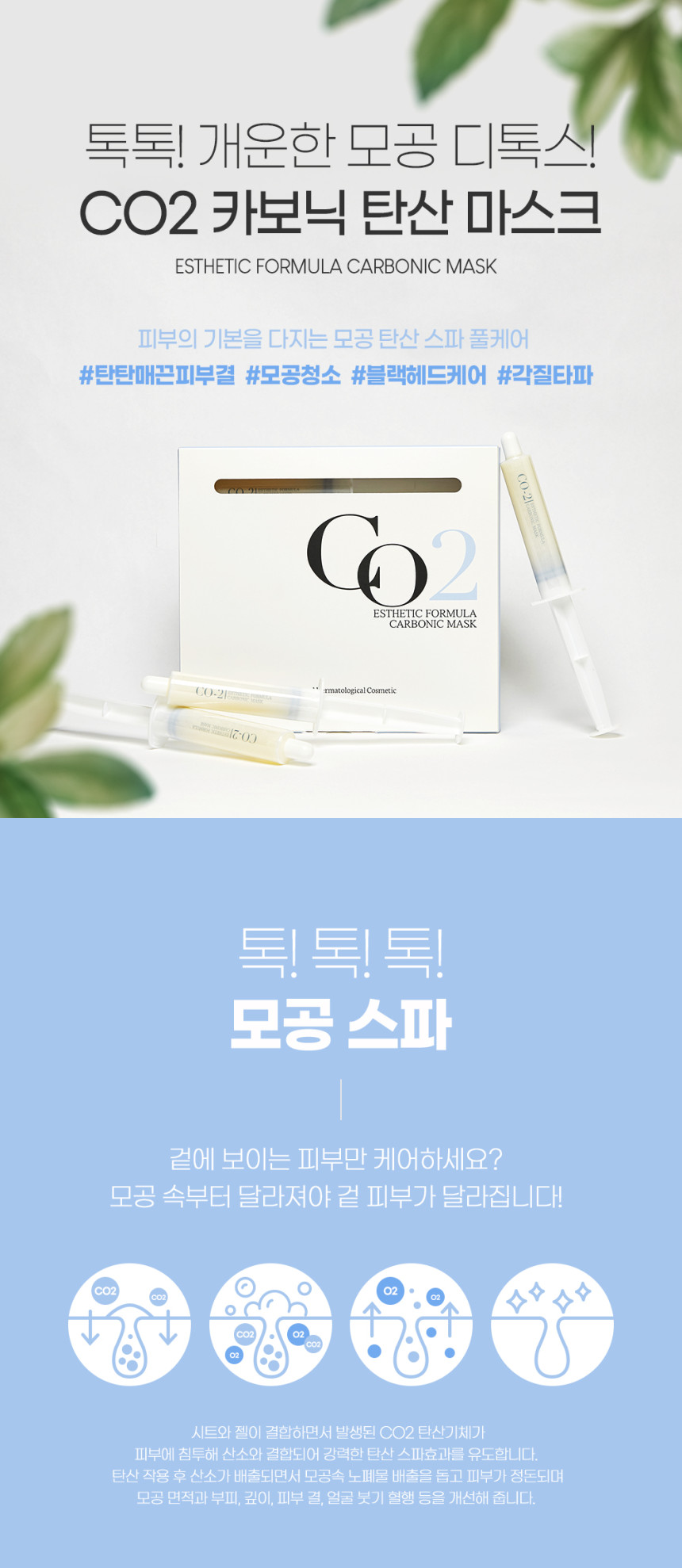 Một bộ sản phẩm trị liệu da bằng carboxytherapy, được tạo ra giúp làm se khít lỗ chân lông, cải thiện các vấn đề da và trẻ hóa da hiệu quả. Nhờ carbon dioxide, được hình thành do phản ứng hóa học giữa gel hoạt hóa và mặt nạ mô. Esthetic Formula Co2 Carbonic Mask có hiệu quả trong việc làm mờ nếp nhăn, nâng cơ mặt, làm sáng các đốm đồi mồi, hydrat hóa da, se khít lỗ chân lông, tăng tốc vi tuần hoàn máu, bình thường hóa cân bằng hydrolipidic.