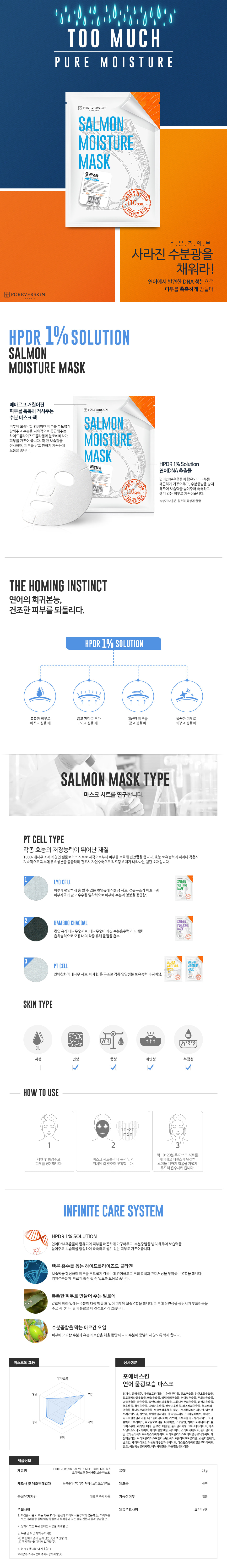 Mặt Nạ Dưỡng Ẩm Tái Tạo Da DNA Cá Hồi Foreversin Salmon Moisture Mask là mặt nạ dành cho da thường, nhạy cảm và hỗn hợp, cá hồi chứa dung dịch HPDR 1% (Axit Deoxy-Ribouncleic được polyme hóa cao). Mặt nạ dưỡng ẩm Salmon sẽ giúp bảo vệ làn da của bạn chống lại lão hóa, tia UV và kích ứng và tăng cường màng bảo vệ da. Nó giúp làm cho làn da khỏe mạnh và đàn hồi và tăng cường làm đều màu da