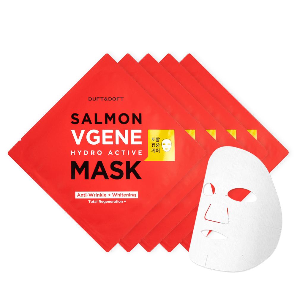 Salmon vgene hydro active mask là sản phẩm mặt nạ dưỡng trắng, chống nhăn đến từ hãng mỹ phẩm DUFT & DOFT. Mặt nạ được thiết kế từ các sợi tơ cao cấp được thấm đẫm bởi các acid amin Omega-3 hoạt tính và DNA natri từ chiết xuất cá hồi có khả năng cấp ẩm, làm trẻ hóa làn da. Ngoài ra, các thành phần từ tự nhiên khác như saccharomyces trà xanh (40%), chiết xuất collagen và ngọc trai hỗ trợ làm trắng da. Mặt nạ Salmon vgene hydro active mask có độ tinh khiết gấp 3 lần so với các sản phẩm khác trên thị trường, cung cấp một trải nghiệm cao cấp nhất cho người sử dụng.