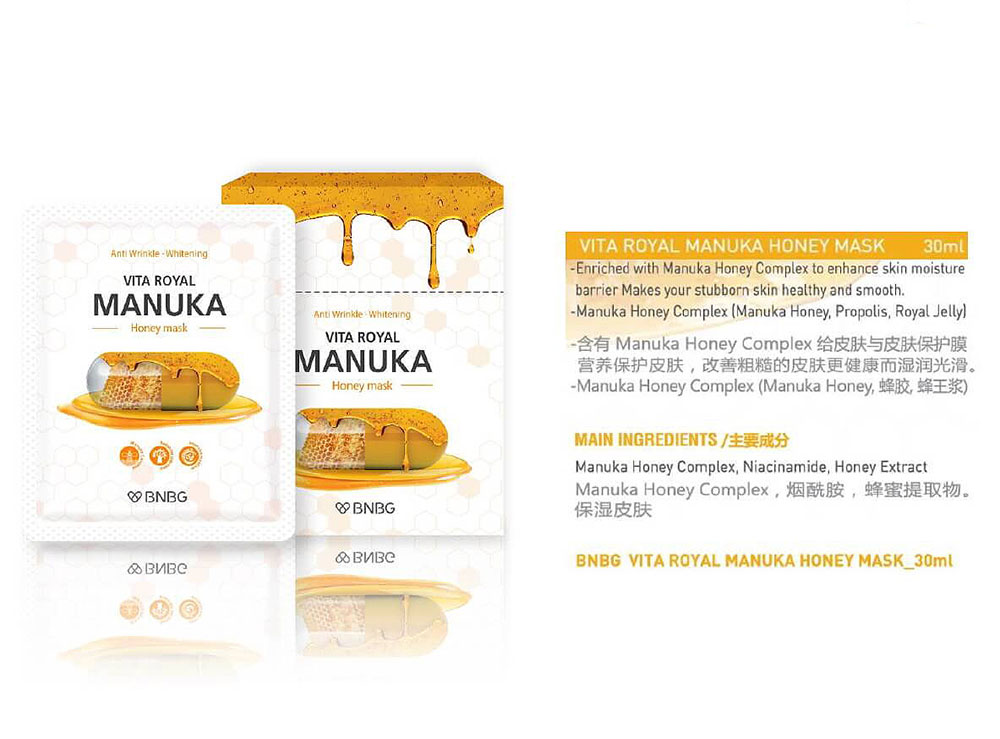 Mặt Nạ Mật Ong Cung Cấp Dưỡng Chất Phục Hồi Da BNBG Vita Royal Manuka Honey Mask là mặt nạ chế tạo từ mật ong Manuka của New Zealand. Chứa các thành phần từ tự nhiên, giúp kháng khuẩn, dưỡng ẩm và phục hồi da bị tổn thương. Cung cấp dưỡng chất tức thòi cho da