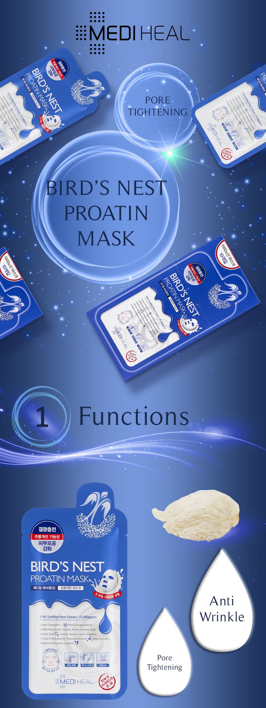 Mặt Nạ Mediheal Tổ Yến Giúp Trẻ Hóa Làn Da Mediheal Bird's Nest Proatin Mask 1 Miếng là mặt nạ thiết kế thông minh kết hợp protein từ động vật chiết xuất từ tổ yến, Acid Amine Acid béo và khoáng chất giúp da khỏe mạnh, tươi trẻ. Cải thiện độ đàn hồi. Giảm sự xuất hiện và làm mờ nếp nhăn.