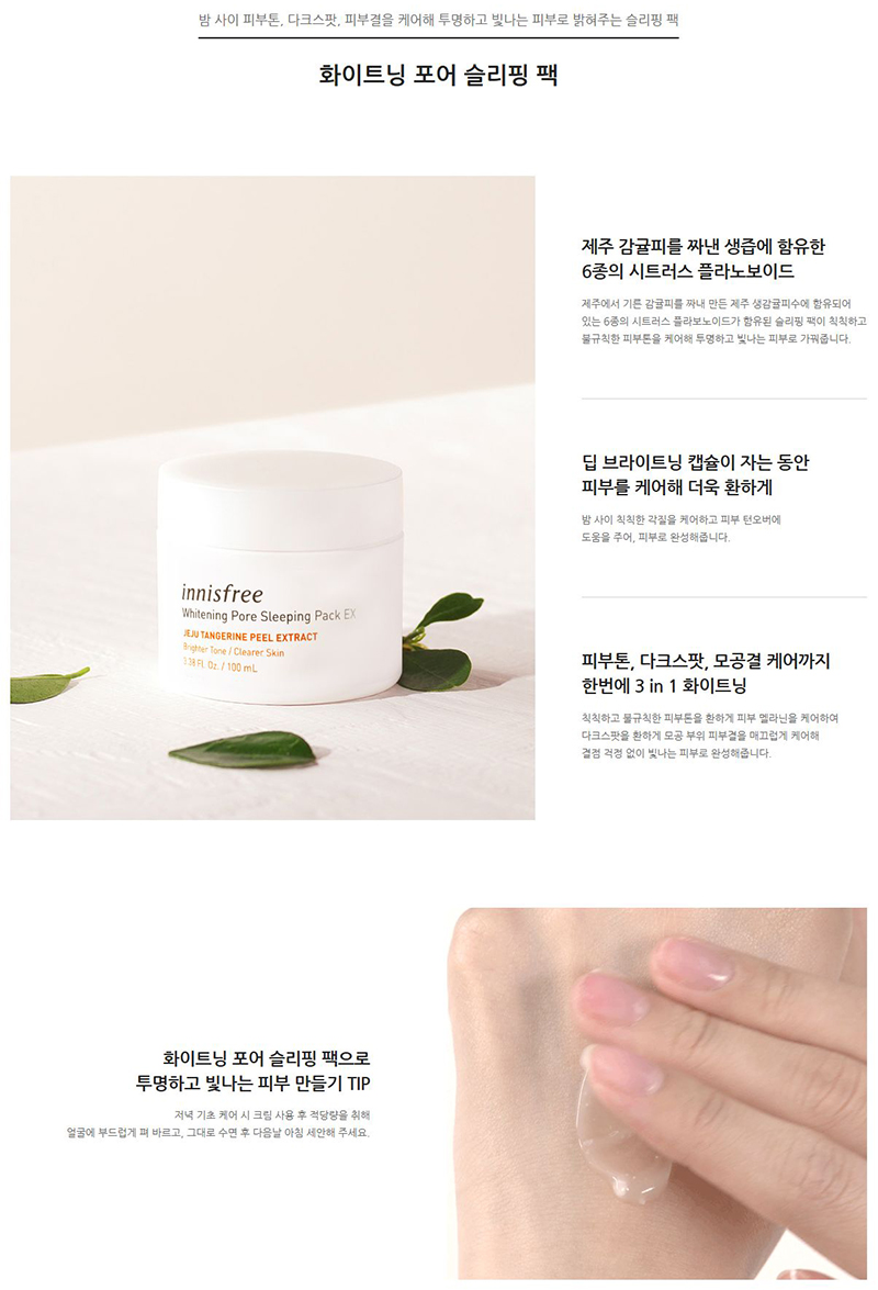 Mặt Nạ Ngủ Dưỡng Trắng Và Chăm Sóc Lỗ Chân Lông Innisfree Whitening Pore Sleeping Pack EX Jeju Tangerine Peel Extract 100ml là mặt nạ ngủ dành cho da dầu, hỗn hợp thiên dầu, lỗ chân lông to, dưỡng trắng và chăm sóc lỗ chân lông. Giải pháp trị thâm nám mới cho làn da nhiều bã nhờn. Chiết xuất Vỏ Quýt dưỡng ẩm, mờ thâm nám