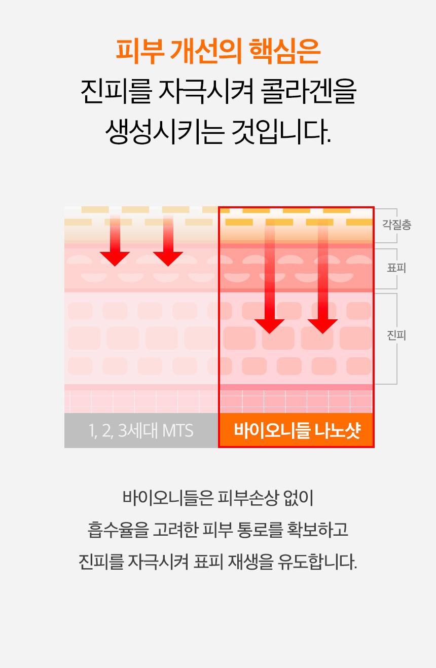 Bioneedle MTS sử dụng kim tương tự như MTS y tế, không để lại sẹo trên bề mặt da với p lực nhẹ nhàng, đều đặn và giảm hơn 80% cảm giác đau so với MTS thông thường.