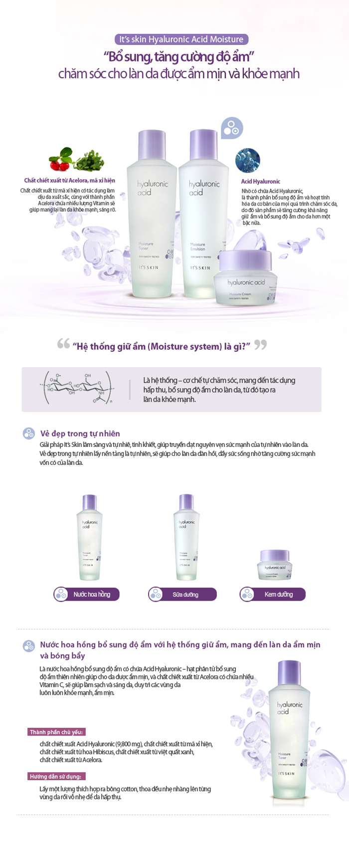 Nước Cân Bằng Bổ Sung Độ Âm It's skin Hyaluronic Acid Moisture Toner 150ml là nước cân bằng giúp bổ sung, tăng cường độ ẩm, chảm sóc cho làm da được ẩm mượt và khỏe mạnh. Chiết xuất từ Mã Xỉ Hiện có tác dụng làm dịu da, cùng với thành phần Acelora chứa nhiều vitamin sẽ giúp mang lại làn da khỏe mạnh, rạng rỡ. Và thành phần Acid Hyraluronic tăng cường bổ sung độ ẩm và giữ ẩm cho da. Chiết xuất từ hoa Hibicus, từ Việt quất xanh.