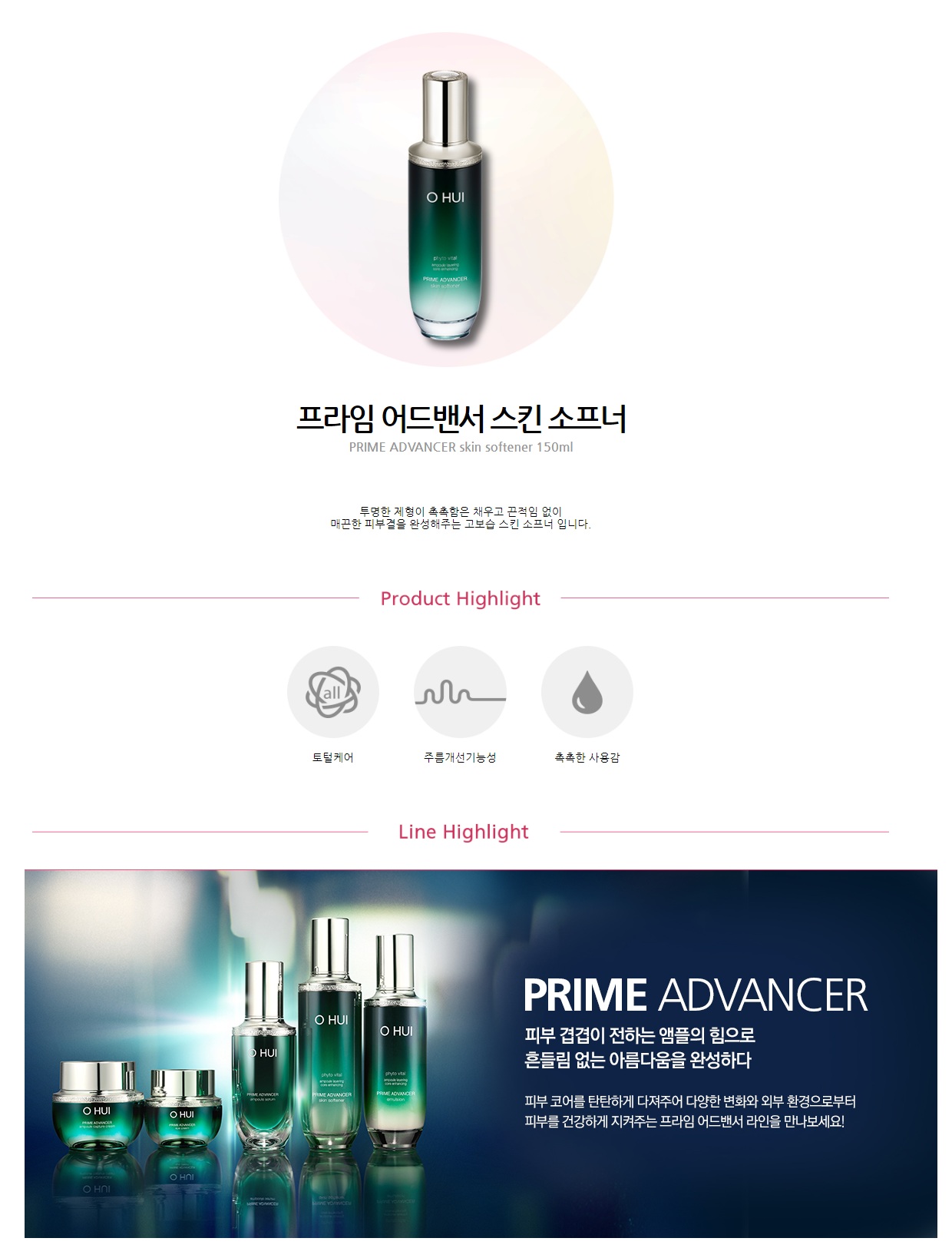 Nước Cân Bằng Chống Lão Hóa Ohui Prime Advancer Skin Softener 150ml là nước cân bằng da với các phân tử tinh chất đậm đặc trong suốt giúp trải đều và thẩm thấu nhẹ nhàng dưỡng chất vào sâu trong da, giúp mang lại làn da ẩm mịn, chắc khỏe mà không hề bết dính, giúp làn da đạt được trạng thái lý tưởng trước khi bắt đầu chu trình chăm sóc toàn diện, cải thiện nếp nhăn cho làn da.
