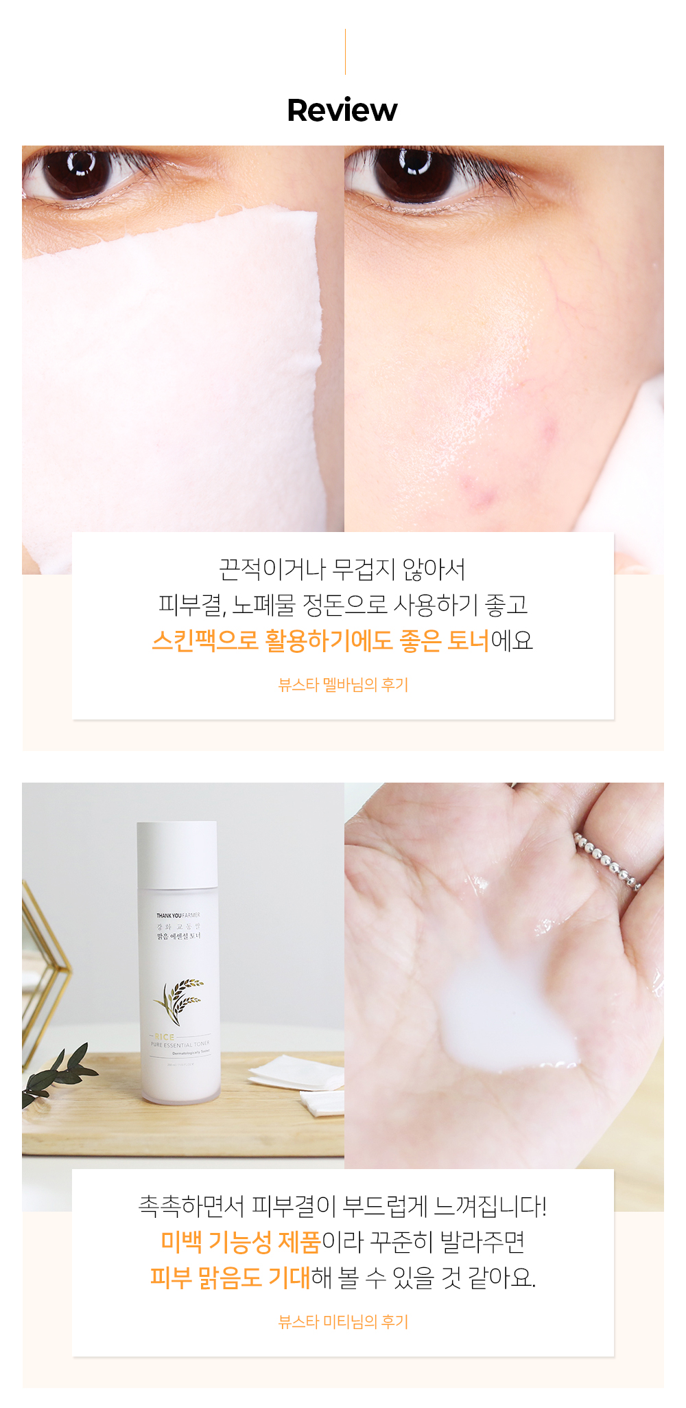 Thank You Farmer Rice Pure Essentail Toner là nước cân bằng da với chiết xuất chính là gạo tinh khiết và tự nhiên, giúp làm trắng da, loại bỏ chất bận còn xót lại trên da sau khi làm sạch, phục hồi lại kết cấu da, bổ sung độ ẩm, điều chỉnh sự cân bằng giữa độ ẩm và dầu cho da.