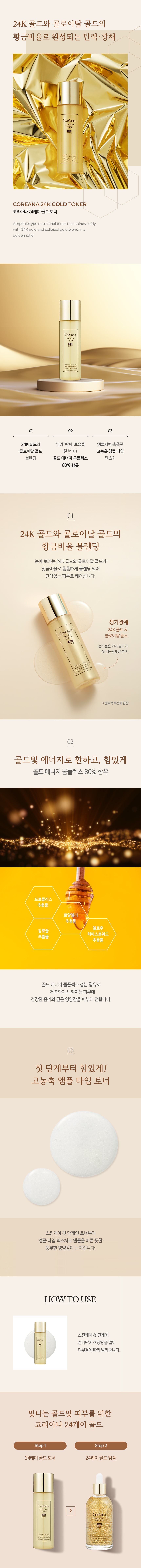 Coreana 24k Gold Toner chứa Vàng 24K nhìn thấy được và vàng keo được hòa quyện chặt chẽ theo tỷ lệ vàng để chăm sóc làn da đàn hồi.