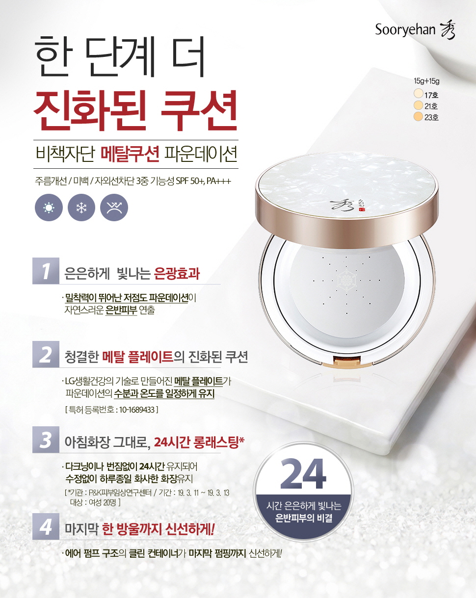 Kem nền Bichaek Jadan Metal Cushion Foundation mang lại làn da sáng mềm mại suốt 24 giờ. Kem nền có độ phù hợp cao mang lại làn da sáng. Thiết kế hộp phấn nước tấm kim loại sạch (bằng sáng chế) - tấm kim loại giữ ẩm và nhiệt độ, giúp cho lớp nền không bị xuống màu hay nhòe, và màu sắc được kéo dài 24 giờ, không cần trang điểm lại.