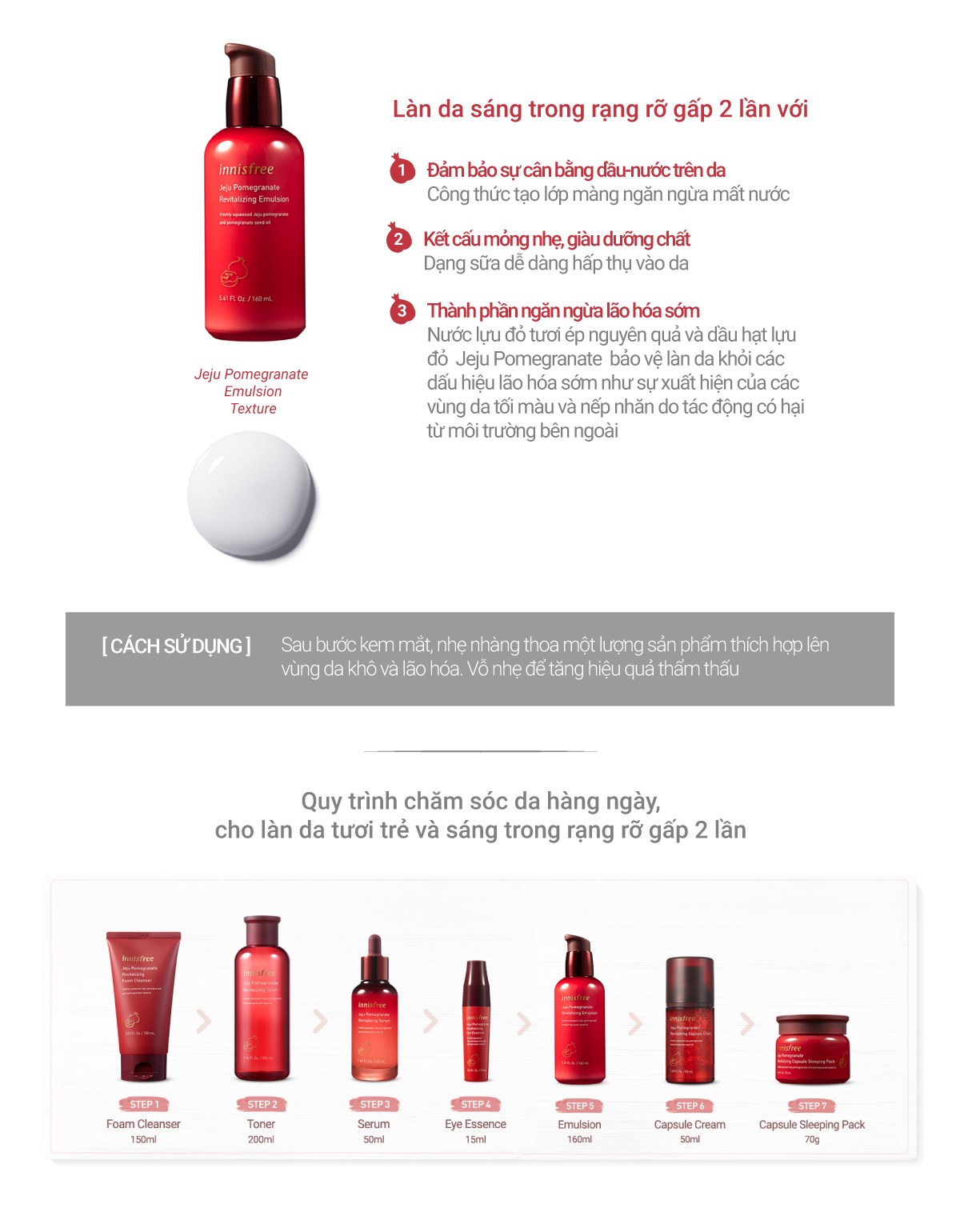 Sữa Dưỡng Chiết Xuất Lựu Innisfree Jeju Pomegranate Revitalizing Emulsion 160ml là sữa dưỡng có chứa nước ép lựu và tinh dầu hạt từ đảo Jeju, thẩm thấu sâu vào da, giúp da mịn màng và khỏe mạnh.