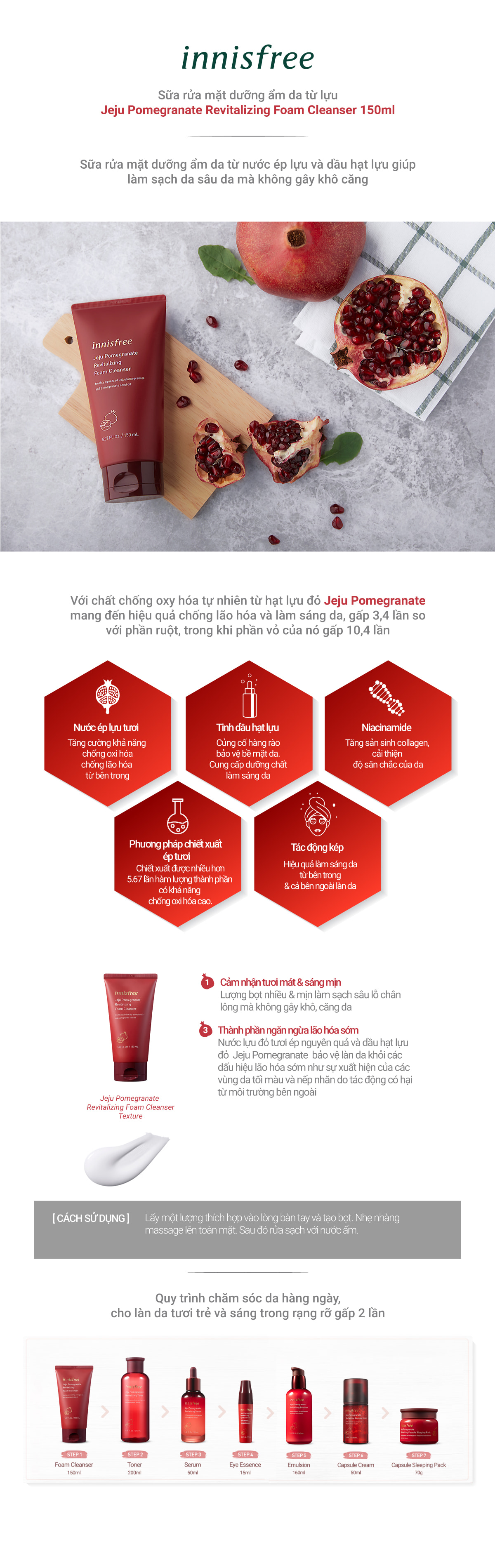 Sữa Rửa Mặt Chiết Xuất Lựu Innisfree Jeju Pomegranate Revitalizing Foam Cleanser 150ml là sữa rửa mặt có chứa nước ép lựu và tinh dầu hạt từ đảo Jeju, tạo lớp bọt mềm và làm sạch da mà không gây kích ứng.