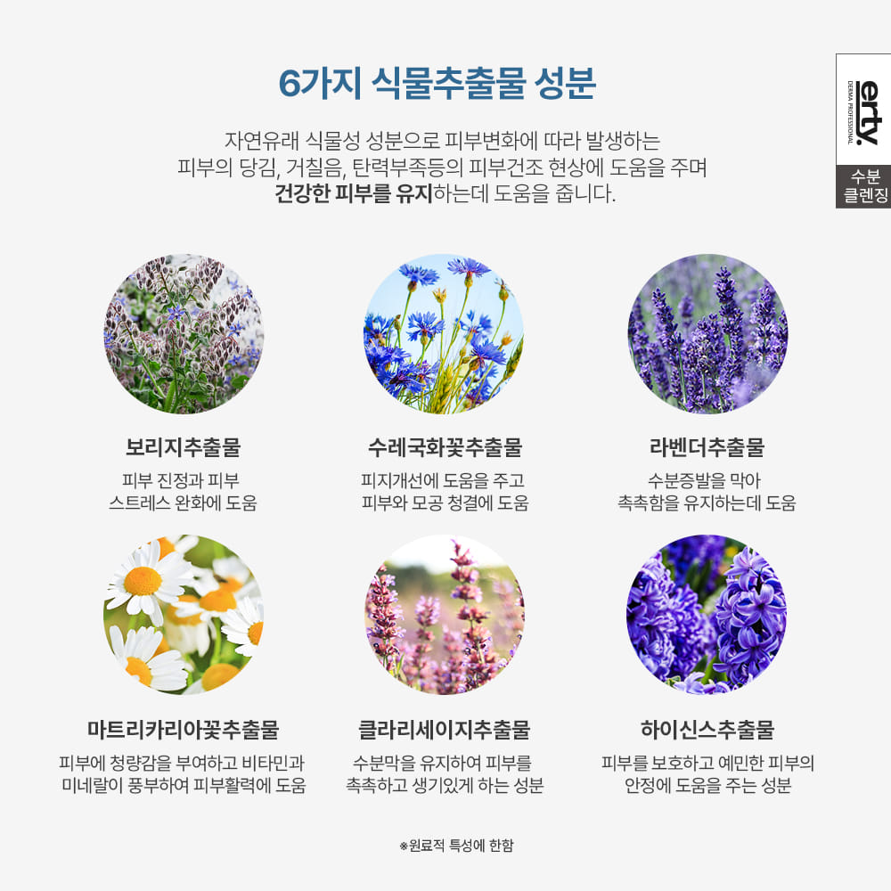 Bao gồm các thành phần như chiết xuất cây lưu ly, chiết xuất hoa oải hương, chiết xuất hoa matricaria và chiết xuất cây clarisse, giúp dưỡng ẩm, làm dịu và bảo vệ da, đồng thời phục hồi và duy trì hàng rào độ ẩm cho da.