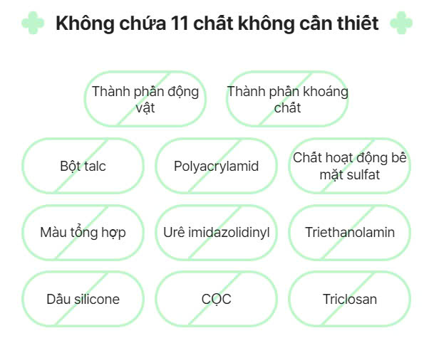 - Hoàn toàn không chứa 11 loại thành phần có hại bao gồm thành phần động vật, khoáng chất, talc, polyacrylamide, v.v.