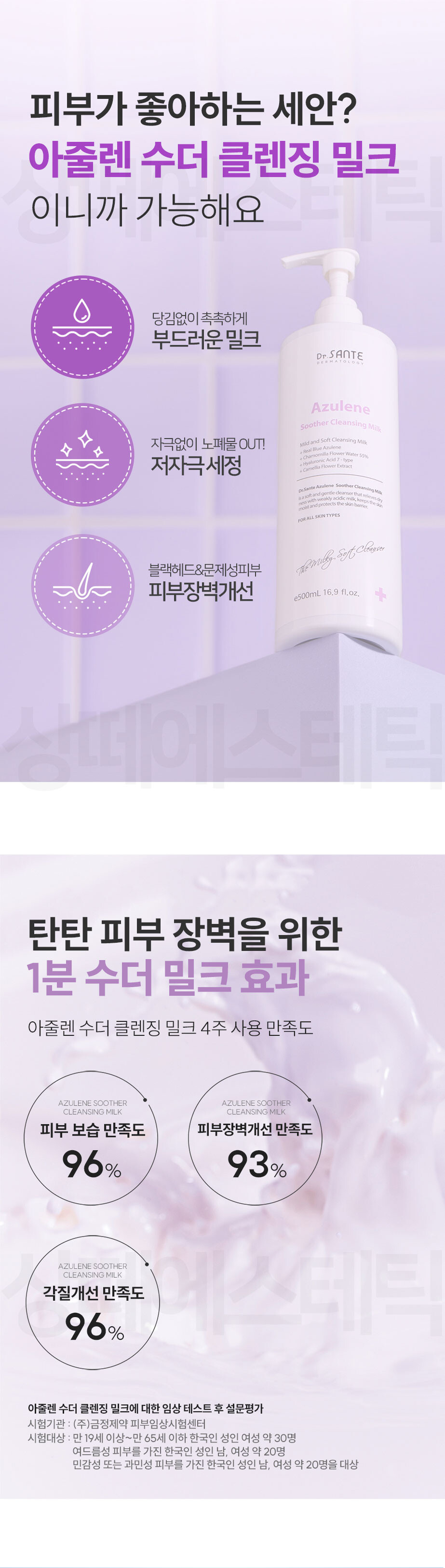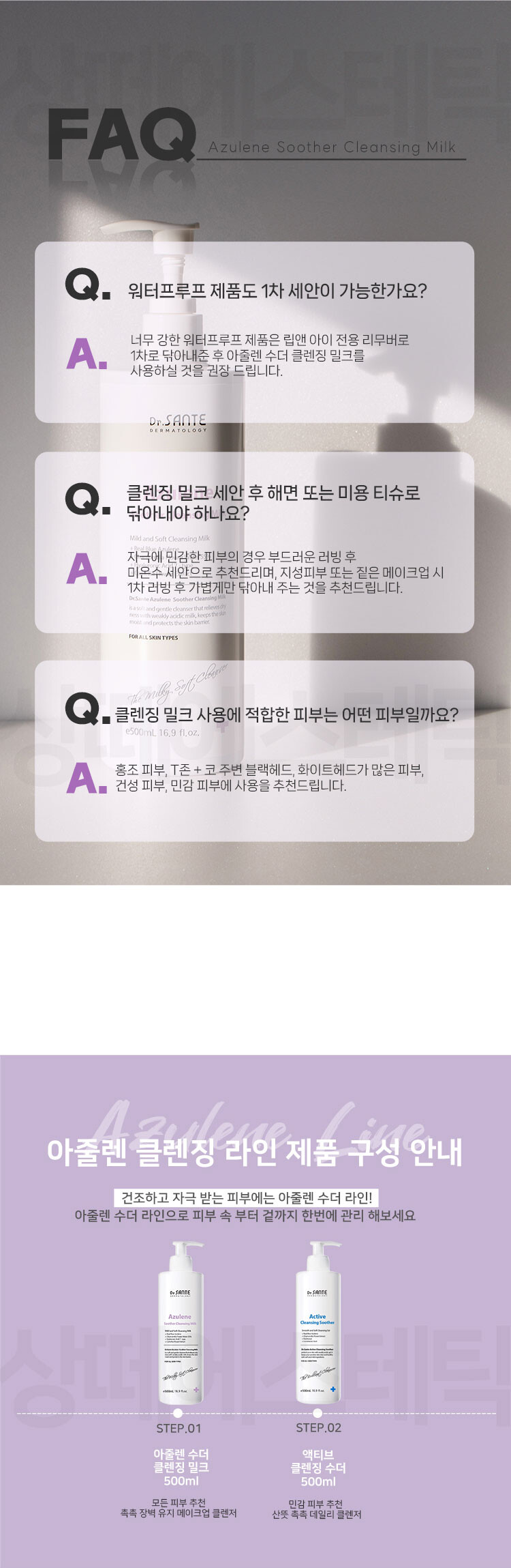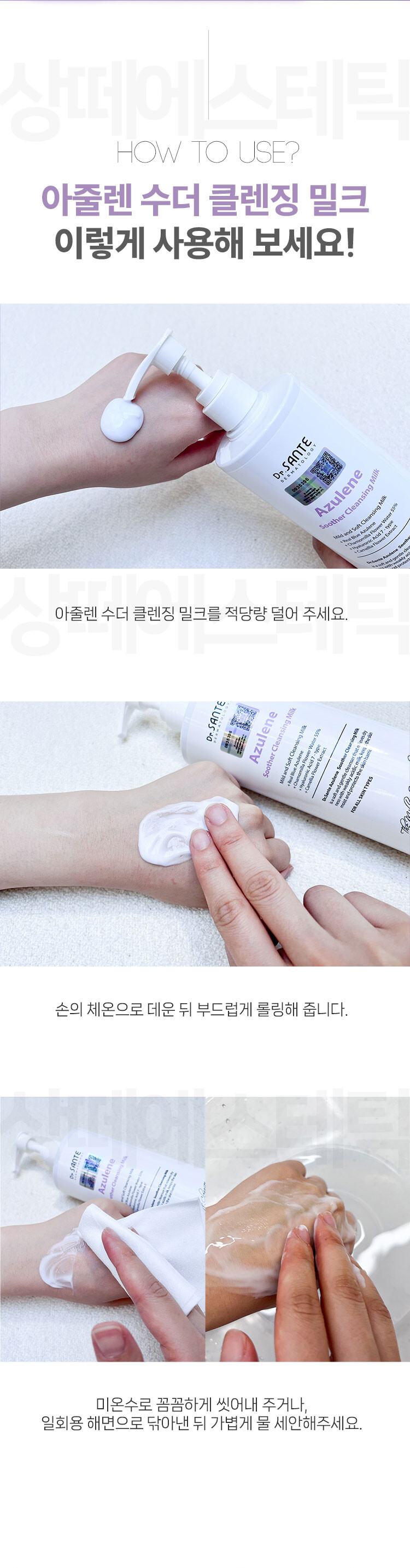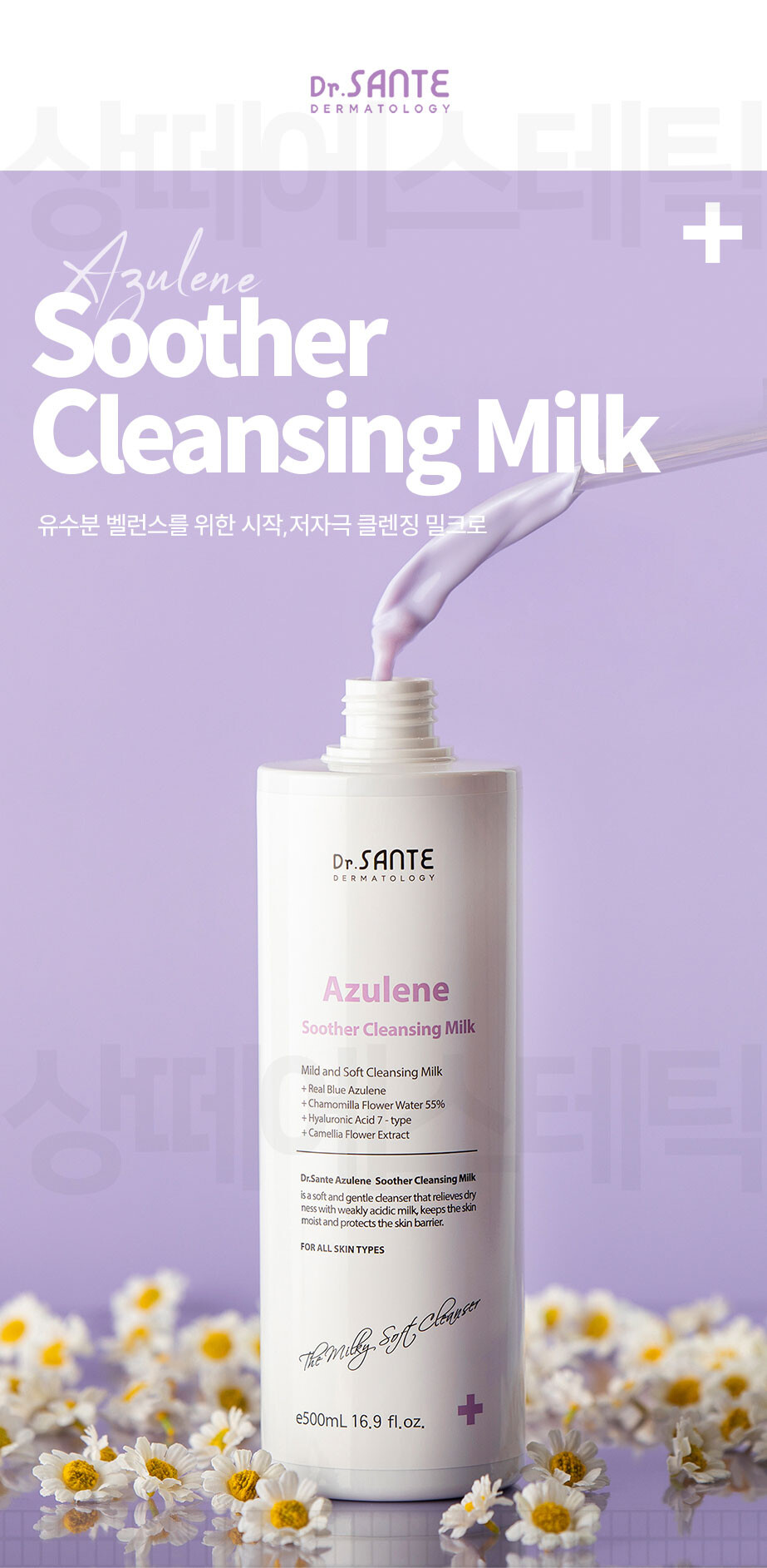 Sữa tẩy trang rửa mặt làm dịu da Dr.Sante Azulene Soothing Cleansing Milk vừa loại bỏ lớp trang điểm, dầu và tạp chất trong khi vẫn giữ được độ ẩm, giúp lỗ chân lông sạch sẽ và làn da của bạn thoải mái và ẩm mượt.