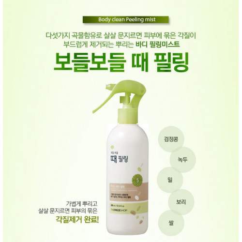 Tẩy tế bào chết dạng xịt The Face Shop Smooth Skin Body Peel có chứa lô hội, ceramide làm cho làn da ẩm mịn. Chiết xuất 100% từ ngũ cốc đậu tương, đậu xanh, lúa mì, lúa mạch, gạo, lô hội, giúp làm sạch da, loại bỏ hoàn toàn các tế bào chết trên cơ thể, mang lại làn da sáng bóng, ko gây kích ứng da.