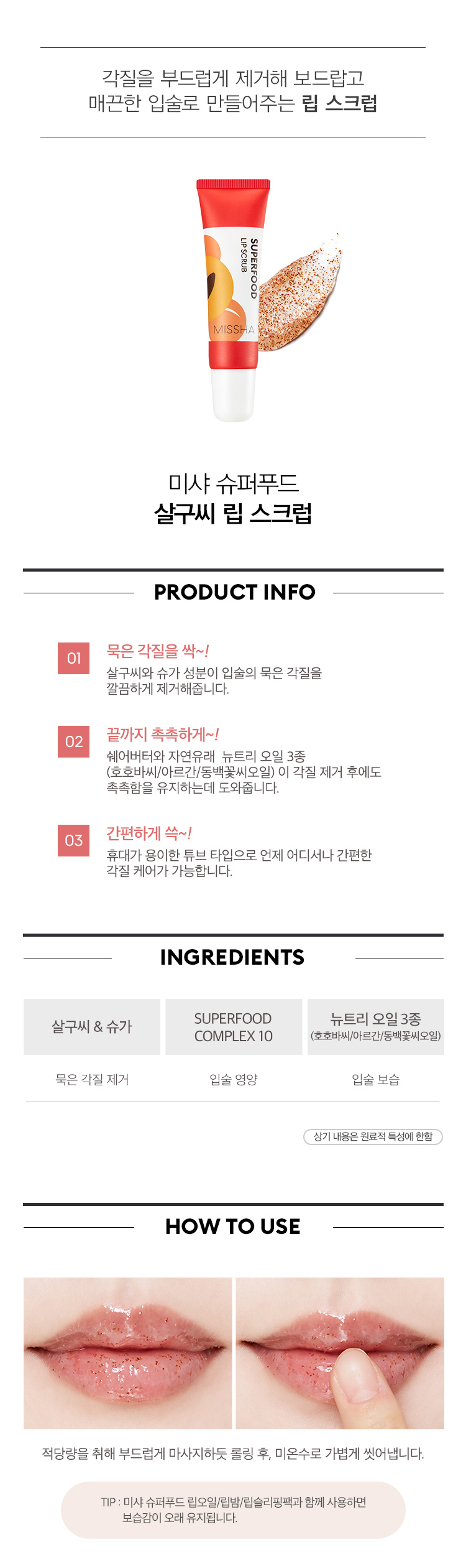 Được chiết xuất từ những thành phần thiên nhiên như: dầu bơ, đường – trắng, nâu hoặc mía và vani. Missha Apricot Lip Scrub có thể thực hiện chính xác trong 1 phút hoặc 30 giây sẽ lấy sạch đi lớp bụi bẩn và tế bào chết trên môi một cách nhẹ nhàng.